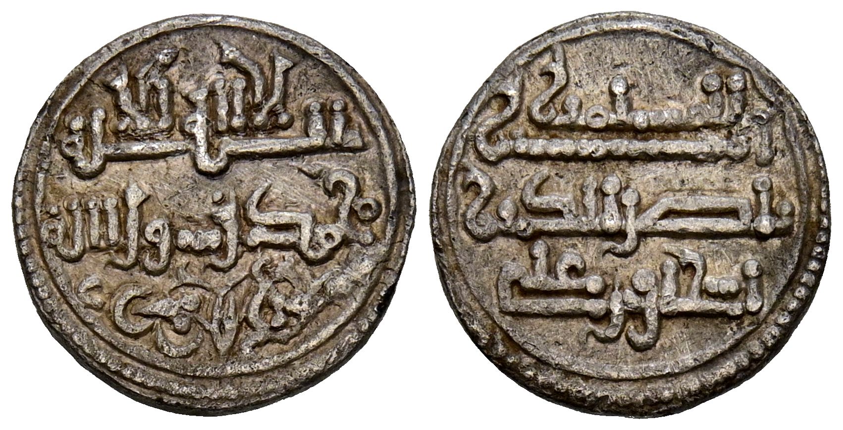 ALMORAVIDES, Ishaq ben Alí (540-541H). Quirate. (Ar. 0,97g/12mm). S/D. (Vives 1896; Benito E2). Anv: 'Sahada' en tres líneas, debajo adorno vegetal. Rev: Presenta a Ishaq con título de amir al-Muslimin y Nasir al Din. MBC+. Escaso.