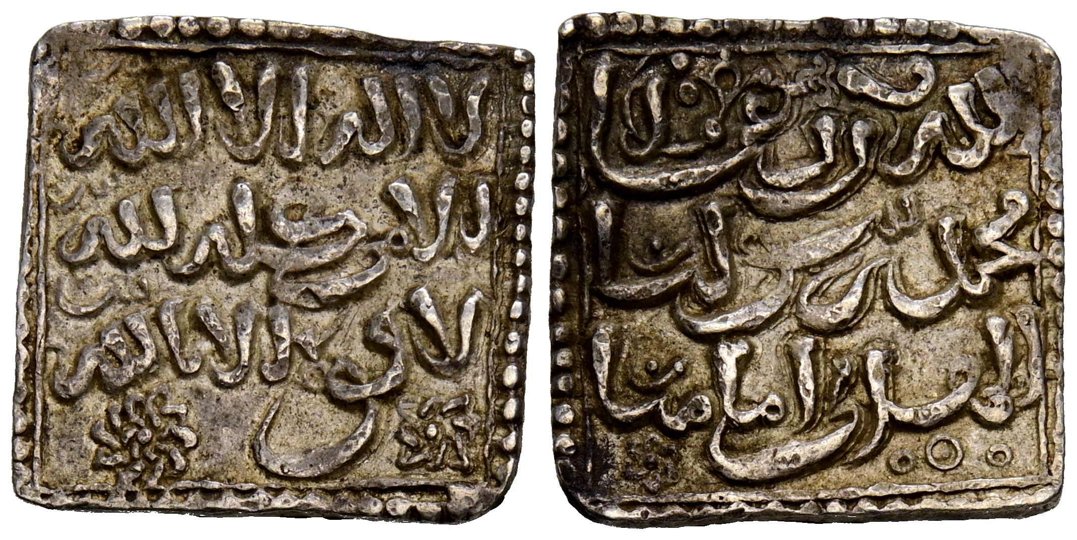 ALMOHADES, Anónima citando a Al-Mahdi. Dirham. (Ar. 1,54g/14mm). S/D. (Vives 2088; Medina 201.a; Hohertz 578). Adornos florales en lugar de ceca en ambas áreas. MBC+. Levemente alabeada.