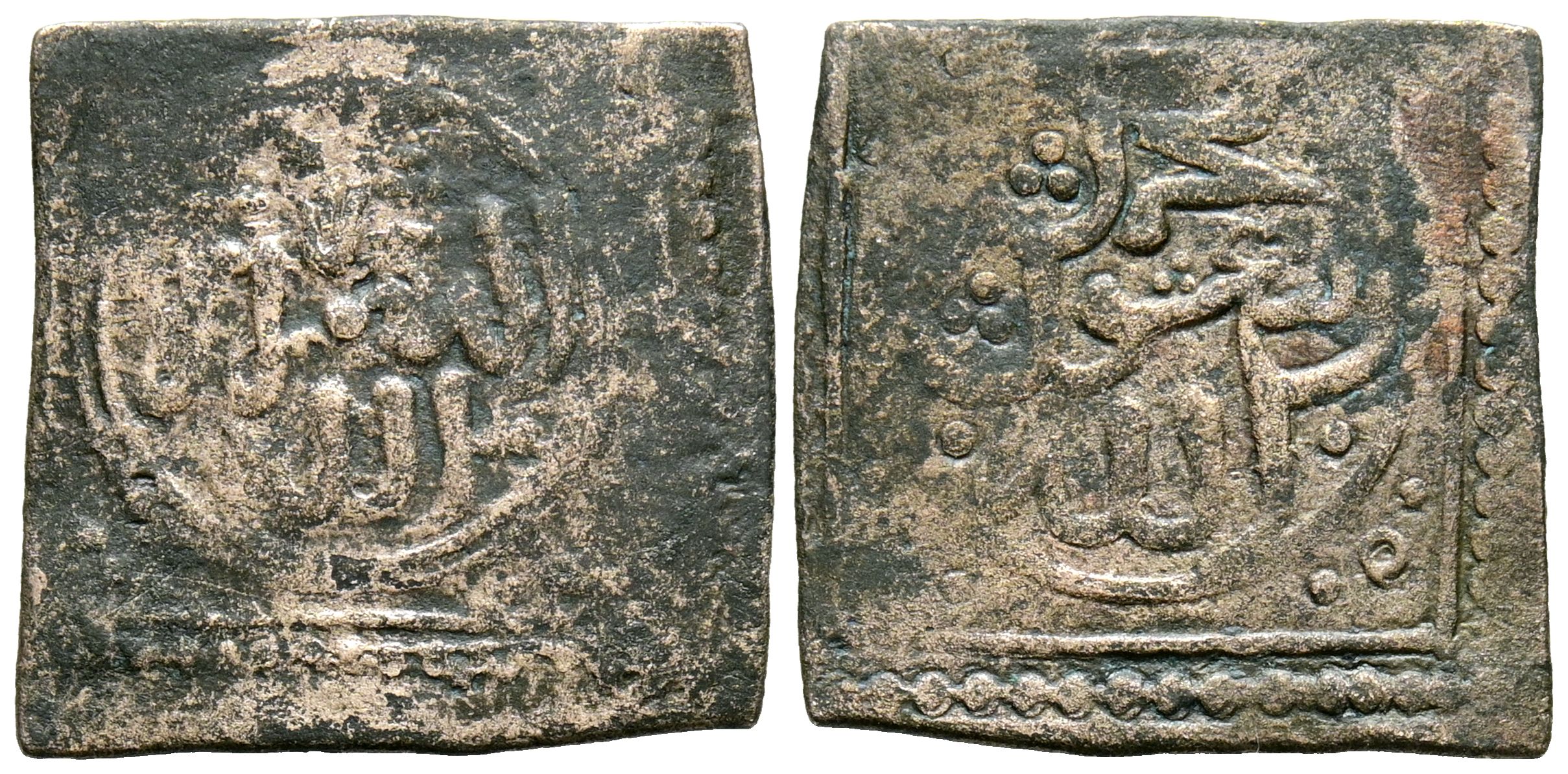 TAIFAS ALMOHADES, LORCA. Ibn Asli, Arráez de Lorca. Dirham. (Ae. 1,35g/16mm). 638-662 H. (Vives No cita; Hohertz 665; Fontenla 2014-Pág. 66). Anv: 'Sahada' en tres líneas dentro gráfila circular: الله / اله الا / لا. Rev: 'Misión profética de Muhamma d' en cuatro líneas dentro de gráfila circular: الله / رسول / ج / محمد. MBC. Acuñación floja. Muy rara.