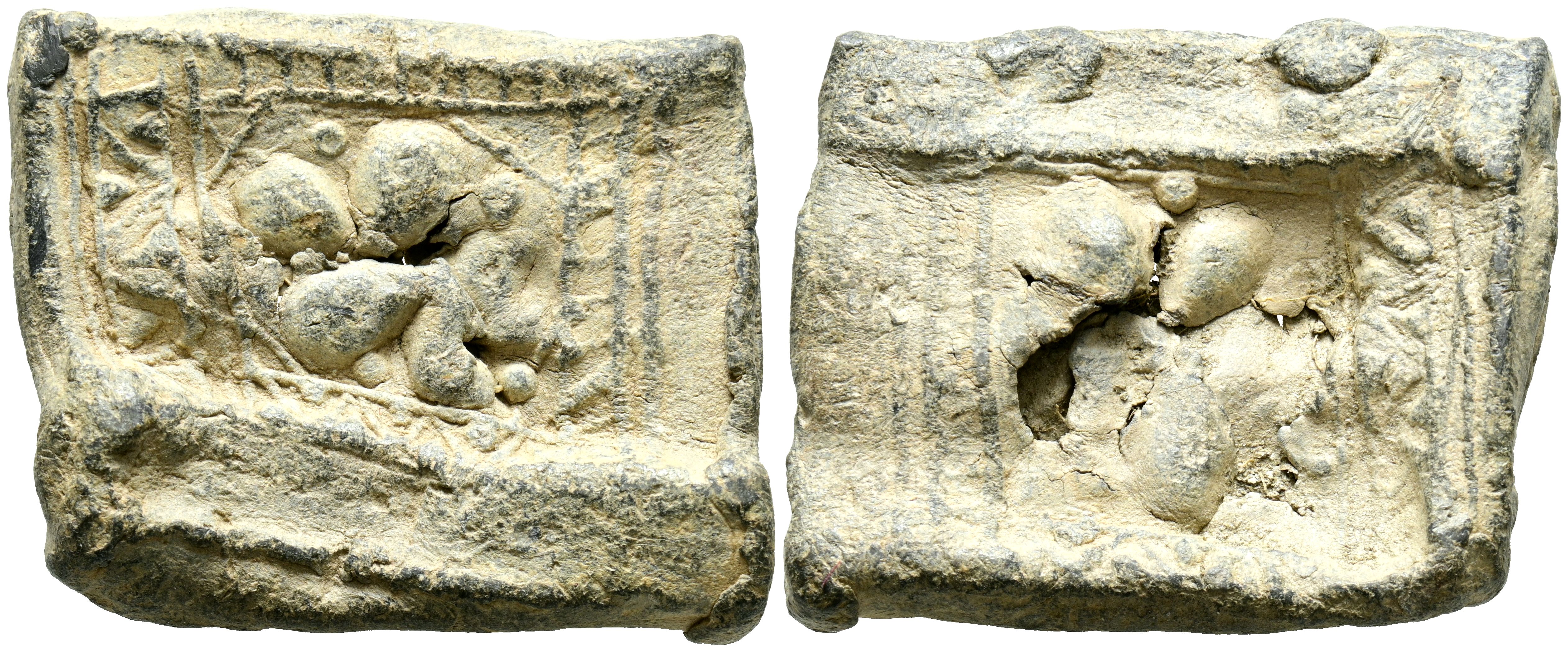 PERIODO CALIFAL O TAIFAS. Amuleto-estuche. (Pb. 22,52g/34x28x7mm). Posiblemente Siglo X-XI. Estuche rectangular de plomo con abertura en el lado menor derecho y restos de dos elementos de suspensión en la parte superior. En ambas áreas, flor central de cinco pelatos enmarcada por una banda decorada con lineas orizontales y trinagulos. BC+.