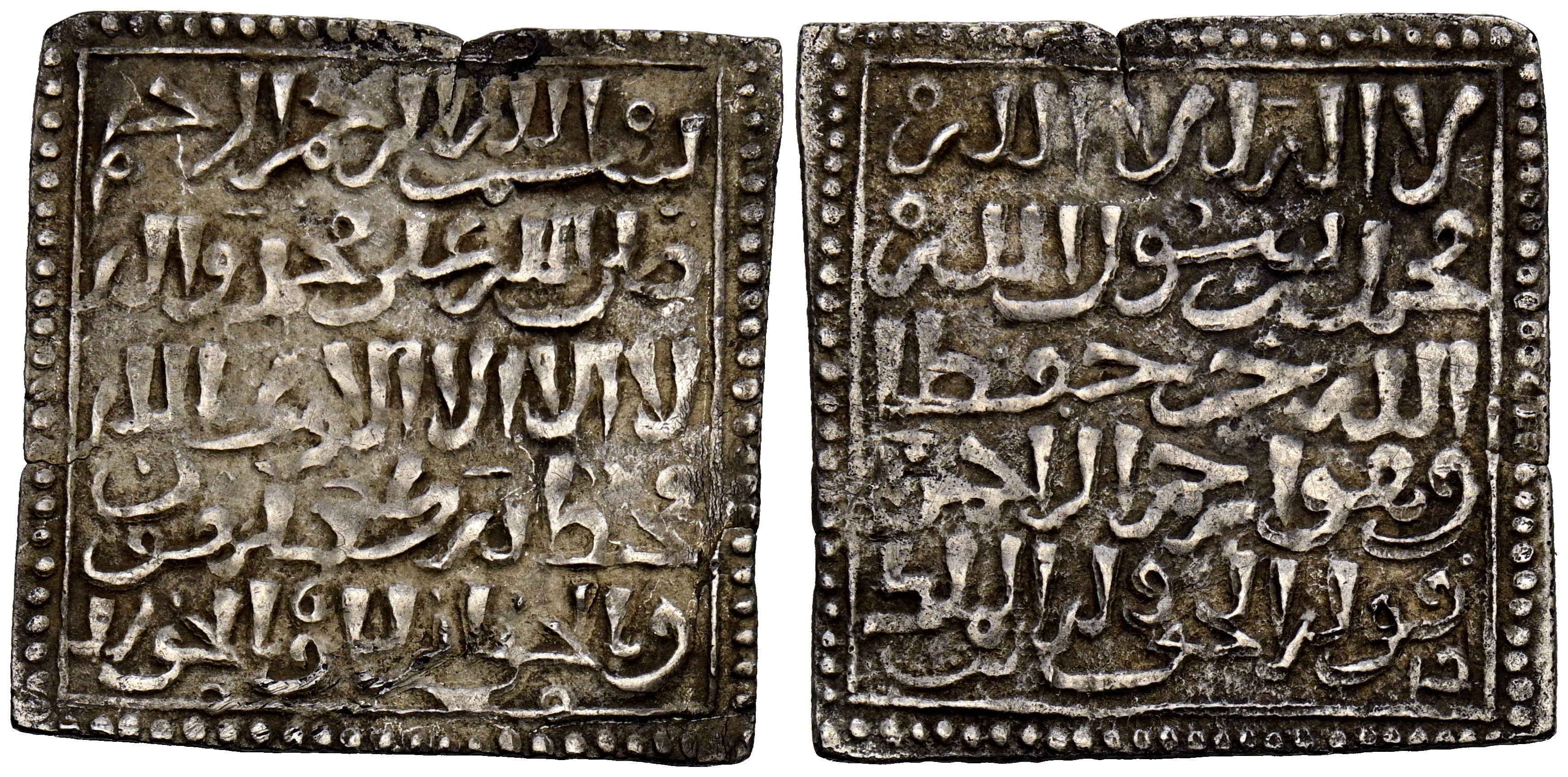 MERINÍES, Anónimo. Doble dirham/amuleto. (Ar. 2,97g/23mm). Finales del siglo XIII o principios del siglo XIV. Fas (Fez) / فا س. (Álbum no cita; Hohertz no cita). Leyenda religiosa dividida en 5 líneas en ambas áreas y ceca divida en las esquinas infe riores del anverso: فا - س. EBC-. Rarísima. Segun nuestras fuentes, solo 3 ejemplares conocidos con ceca, este fue publicado por Felipe Agüera el 6 de abril de 2025 en el grupo de moneda hispano árabe.Aunque esta pieza es similar a los dobles y c uádruples dirham de Abu Hafs 'Umar (Album 493S y 493T), actualmente se considera una emisión meriní muy temprana.