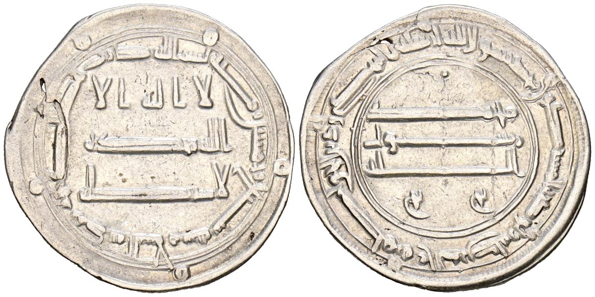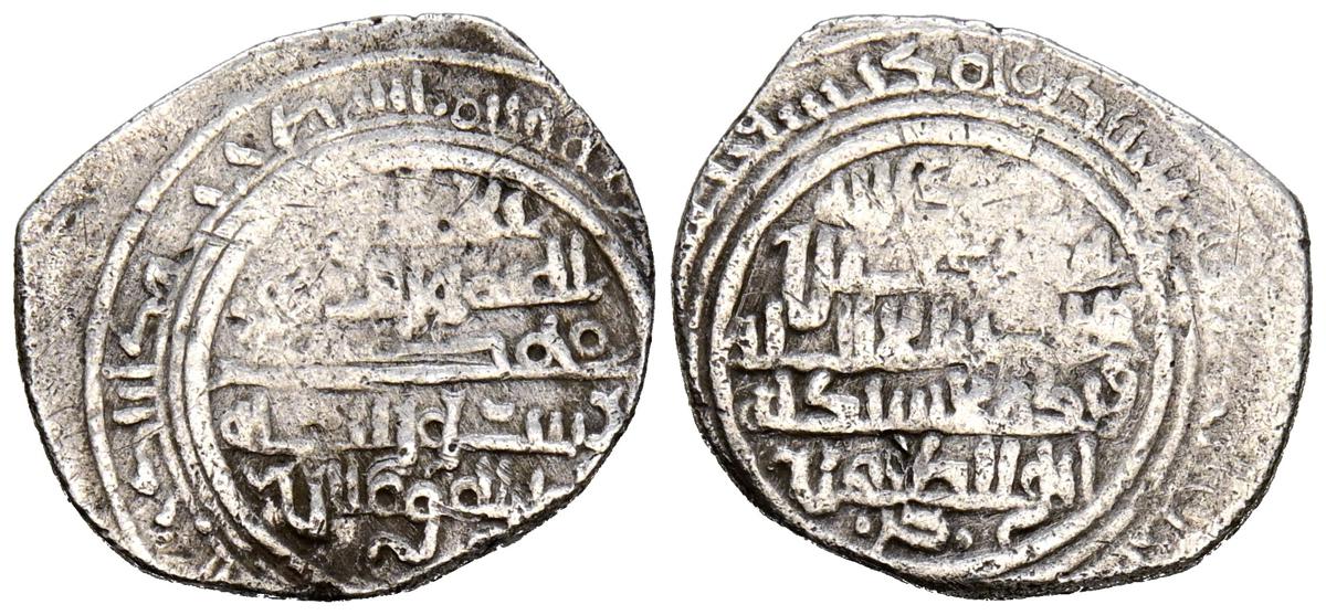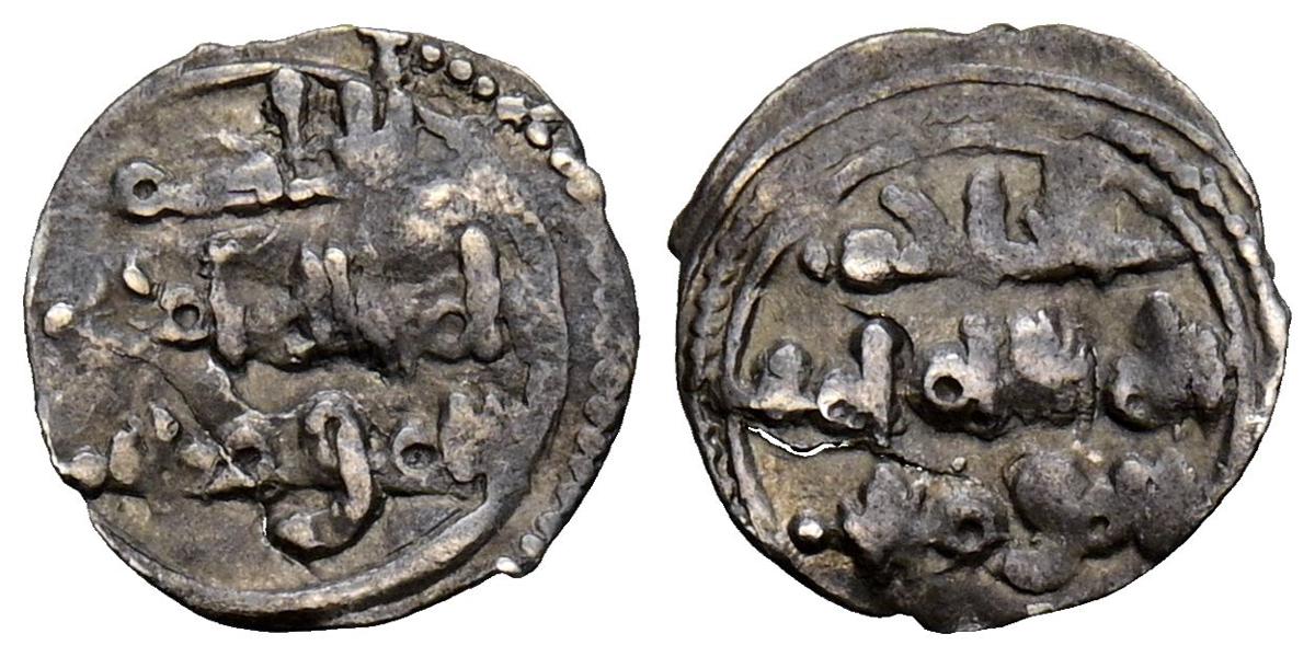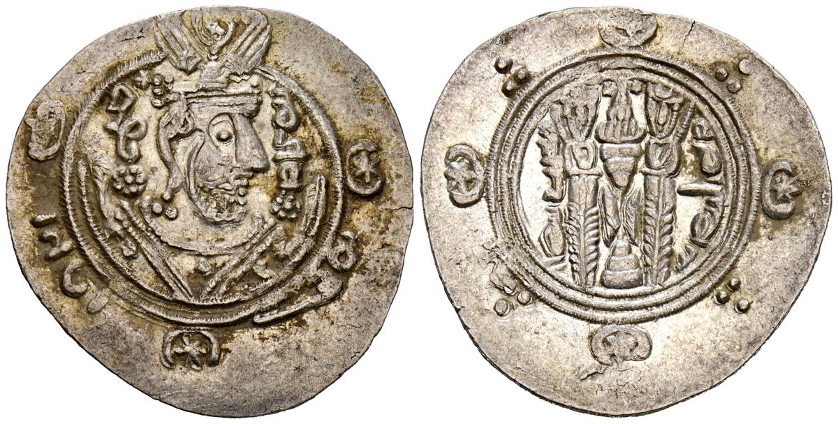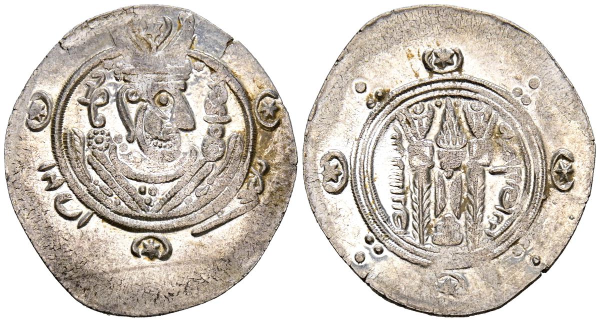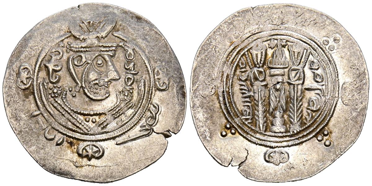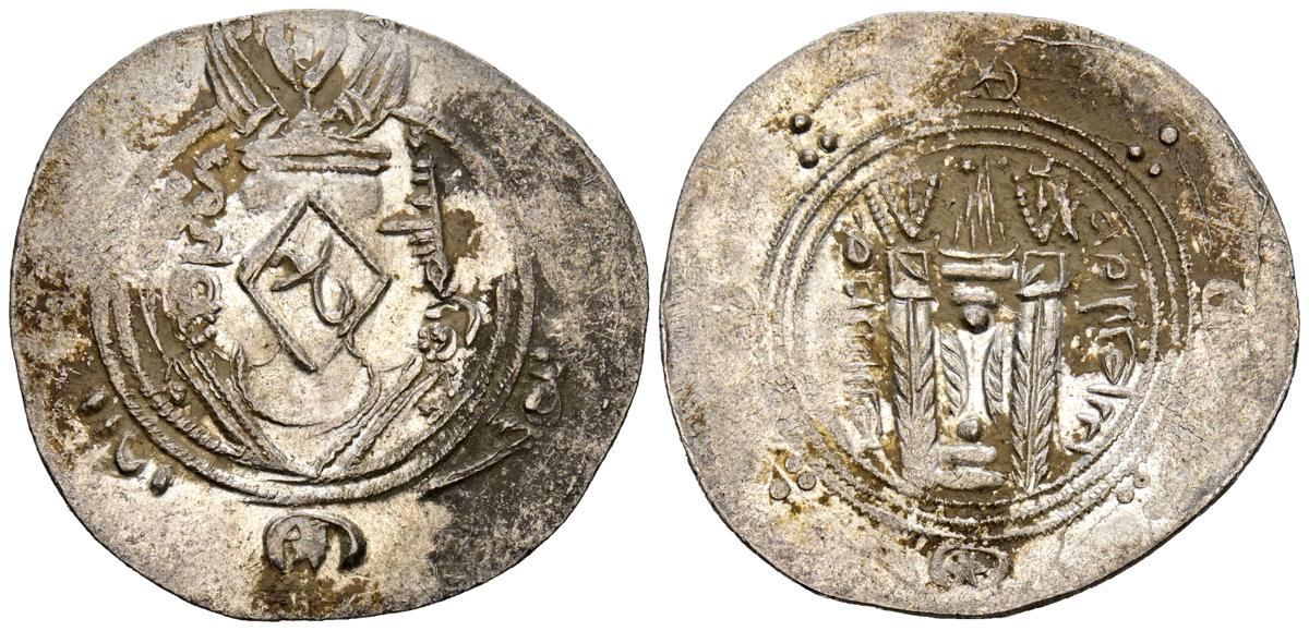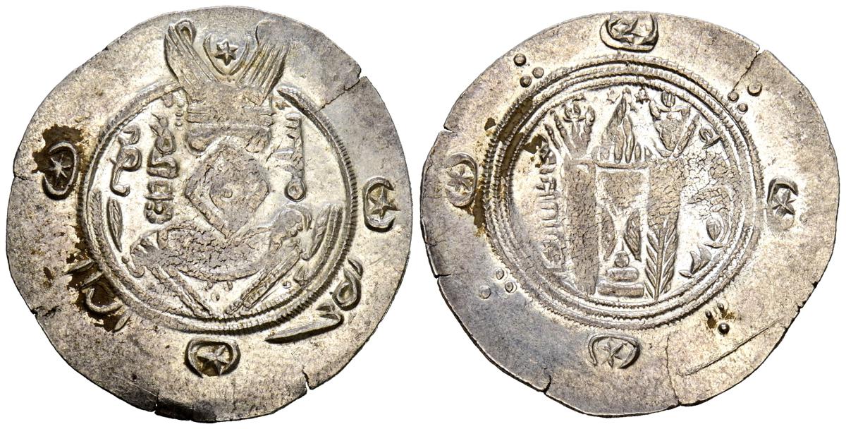 CALIFATO ABASIDA, Anónimo. Dirham Tabarí. (Ar. 1,97g/23mm). 125 PYE/160H/776-7 d.C. Tabaristán. (Álbum73). Anv: Busto con corona alada mirando a derecha de tipo sasánida, leyenda en palavhi: a la derecha, ABZUD (Crecimiento) y a la izquierda, GDH (Explendor). En el exterior, a las 2h, 6h y 10h, creciente y estrella. Abajo a la derecha la palabra palavhi: ADB (Excelente) y a izquierda NEK (Bueno). Rev: Altar de fuego flanqueado por dos sacerdotes, a la derecha: Tapurstan (Tabaristán), y a izquierda año de acuñación: 125 PYE (Post Yazgard Era) dentro de 3 orlas, en el exterior, a las 12h, 3h, 6h y 9h creciente y estrella, y en medio de estos adornos 3 puntos en forma de triángulo. MBC.
