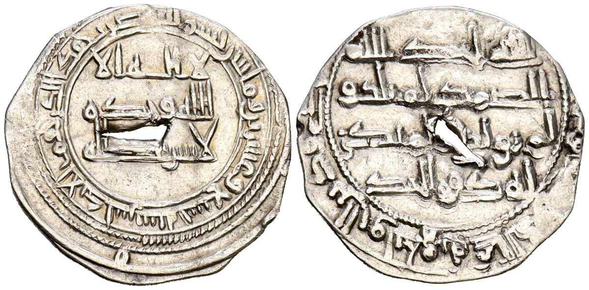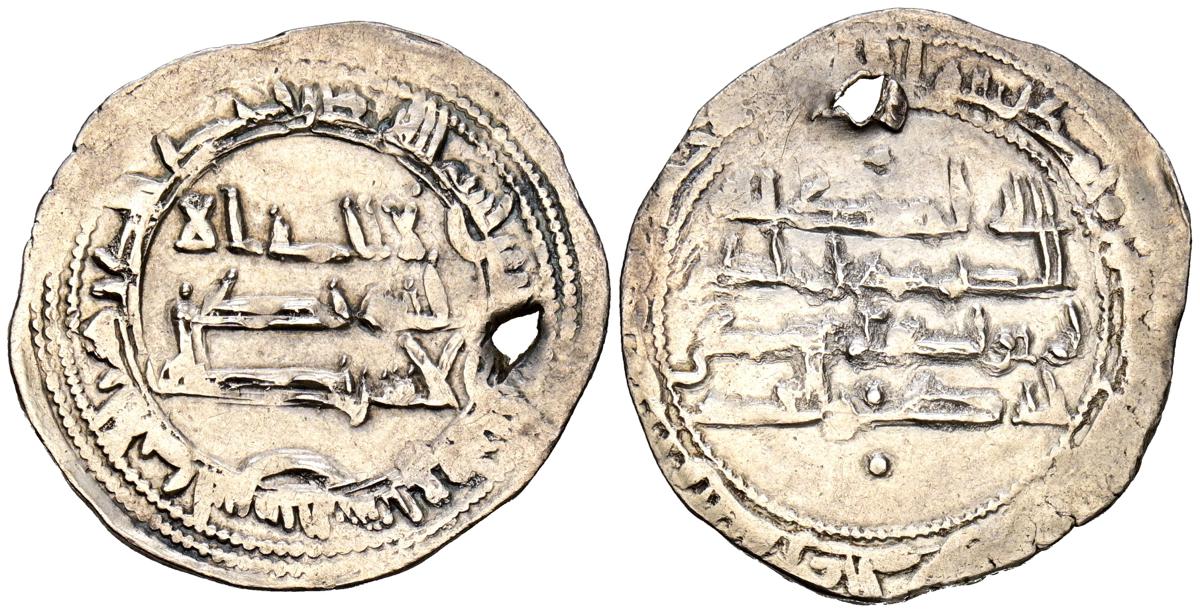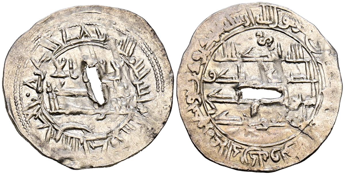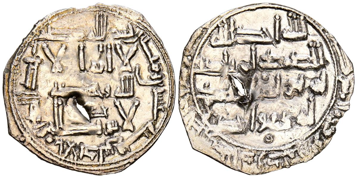 EMIRATO INDEPENDIENTE DE CÓRDOBA. Abd al-Rahman II. Dirham. (Ar. 2,62g/26mm). 236H. al-Ándalus / الاندلس. (Vives 210; Frochoso 236.1). MBC. Pequeña perforación que no afecta a la lectura.
