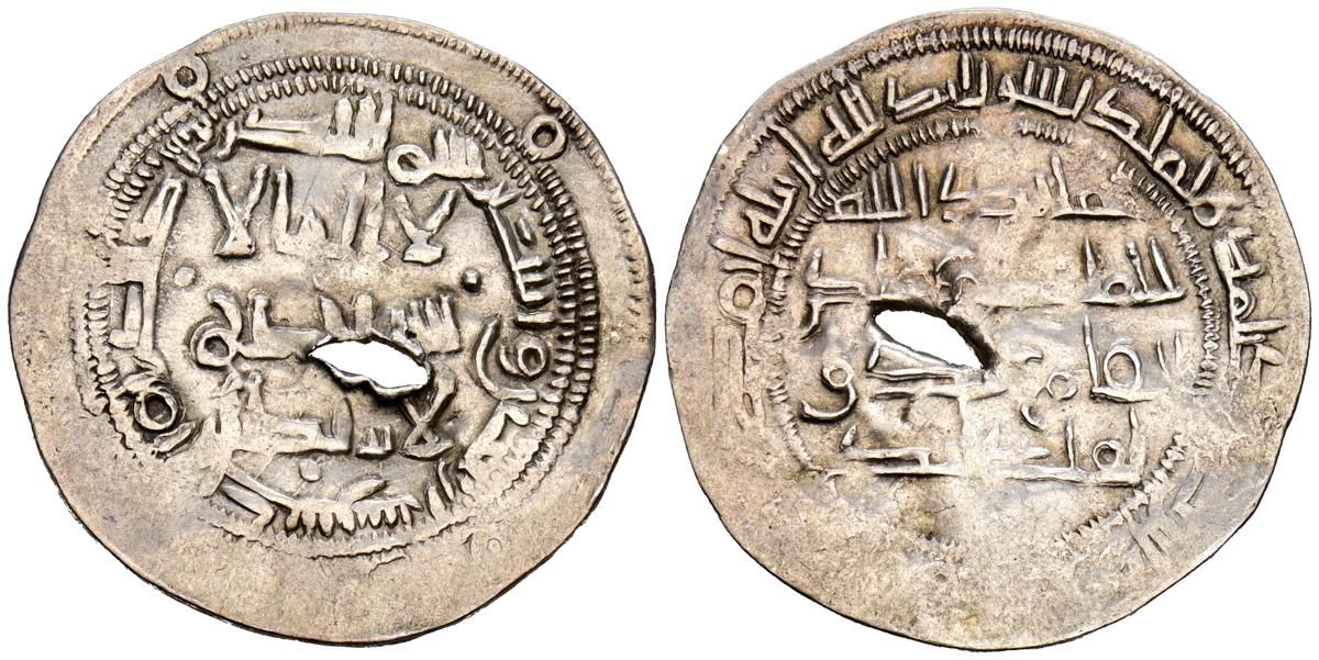EMIRATO INDEPENDIENTE DE CÓRDOBA. Anónimo. Dirham falso de época. (Ar. 2,45g/28mm). ¿(2)40H? al-Ándalus / الاندلس. MBC-. Perforación central. Interesante y rara pieza para estudio.
