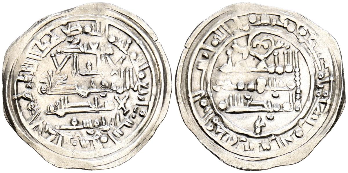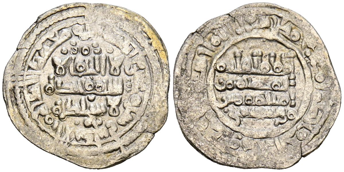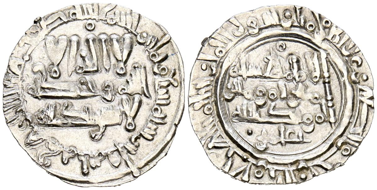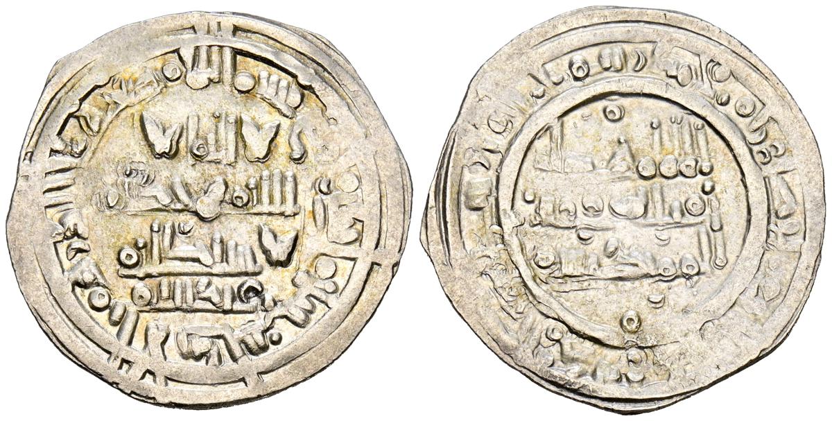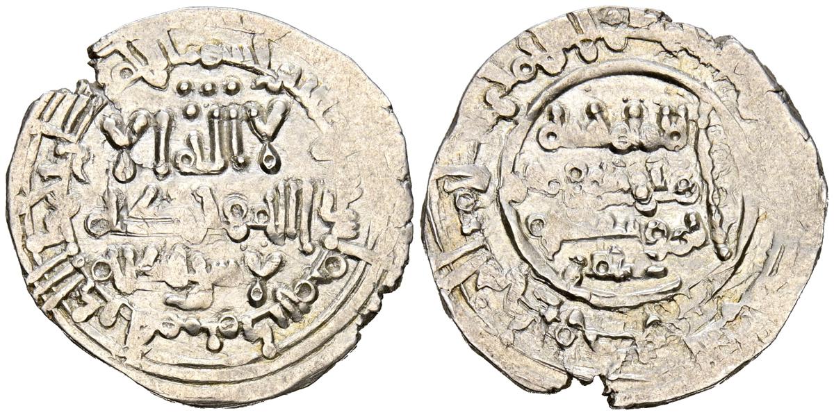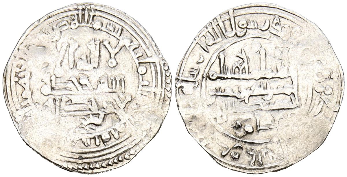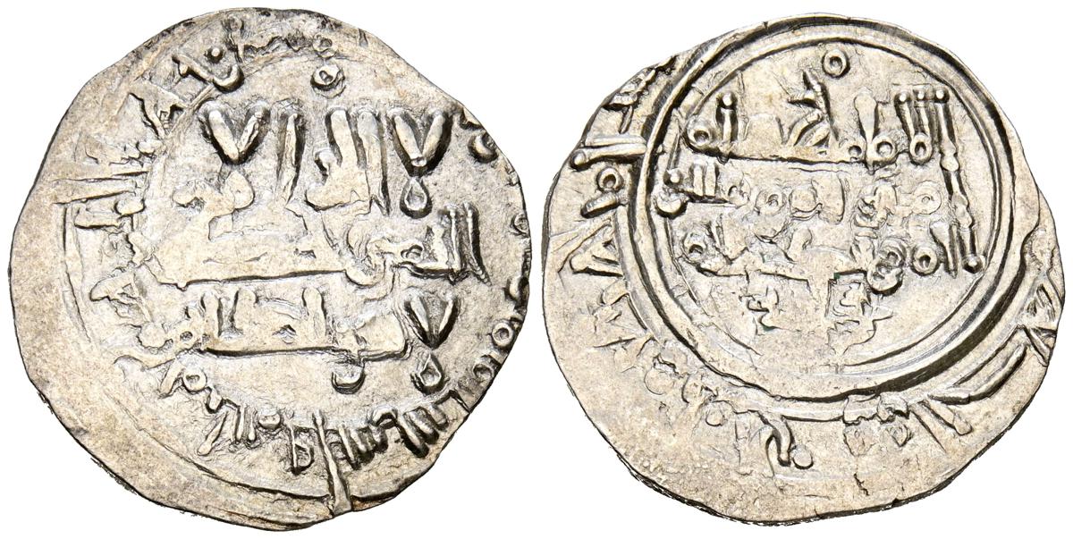 CALIFATO DE CORDOBA, Hisham II. Dirham. (Ar. 3,55g/24mm). 389H. Madinat Fas (Fez) / مدينة فاس. (Vives 622). Citando a 'Abd Allāh / عبداللة en IA. y 'Āmir / عامر en IIA. MBC+. Acuñación muy cuidada para esta ceca. Extraordinario y muy raro ejemplar.