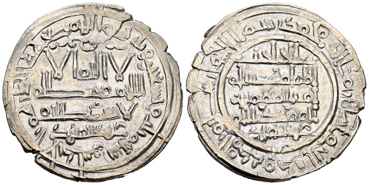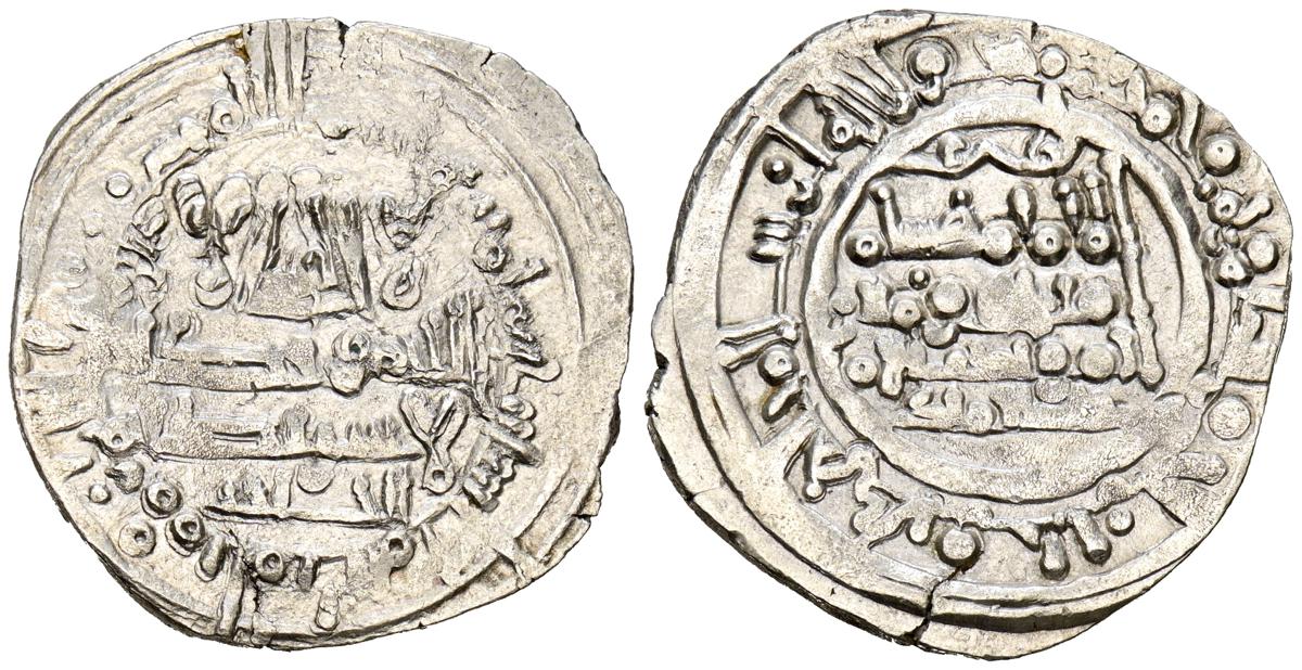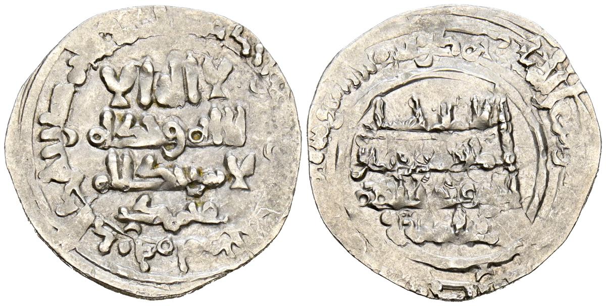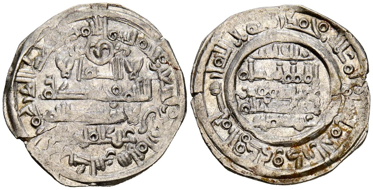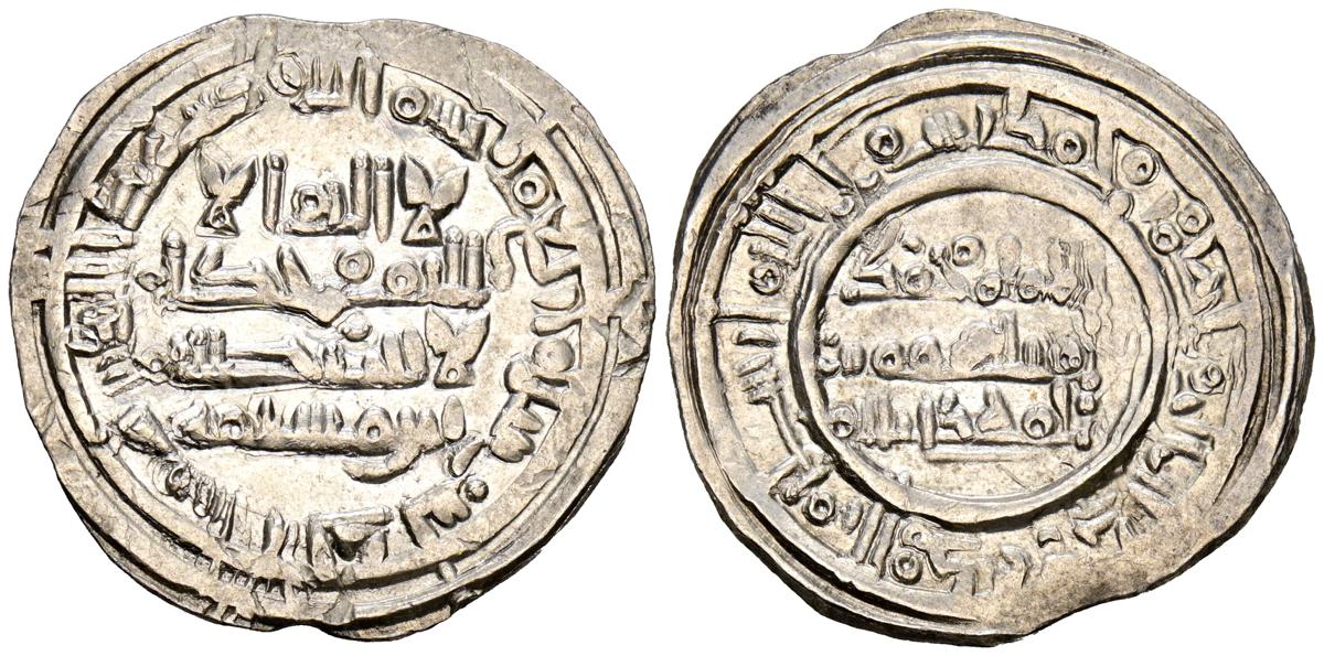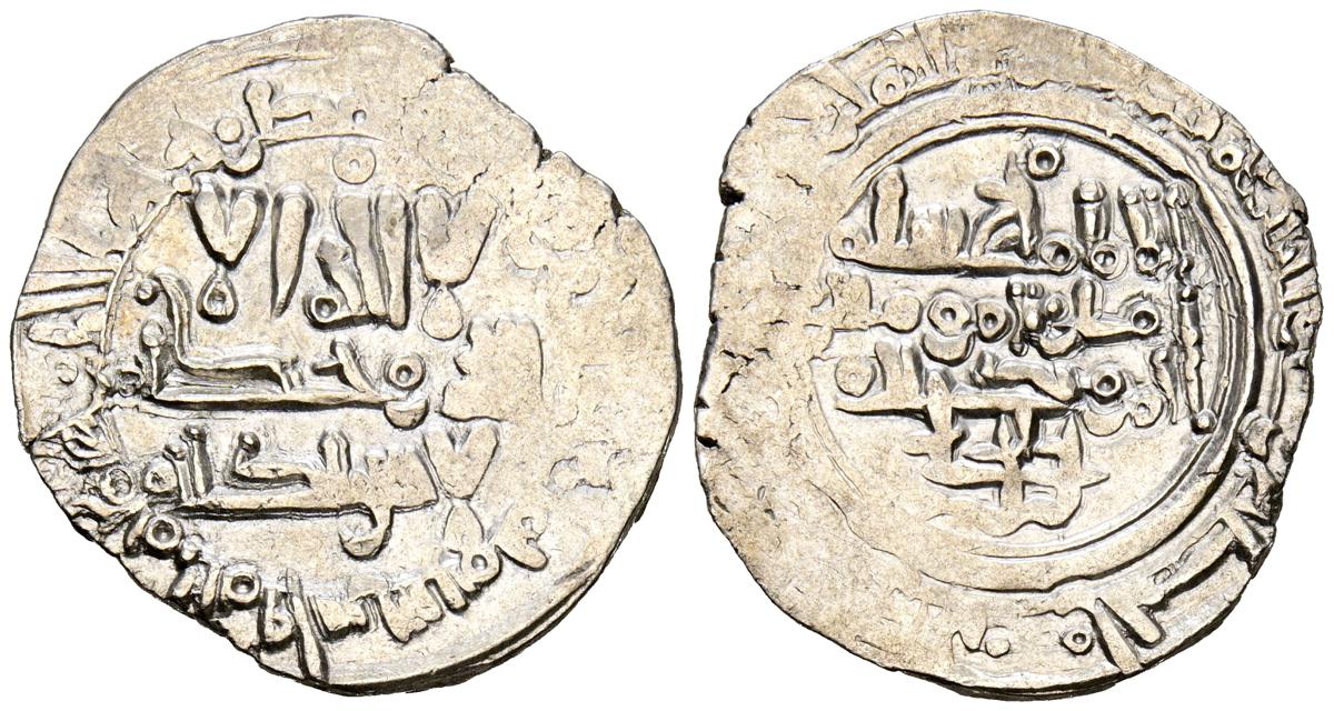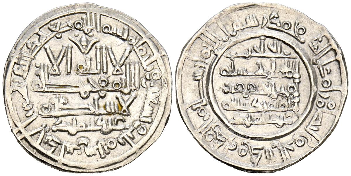 CALIFATO DE CORDOBA, Hisham II. Dirham. (Ar. 3,55g/24mm). 389H. Madinat Fas (Fez) / مدينة فاس. (Vives 622). Citando a 'Abd Allāh / عبداللة en IA. y 'Āmir / عامر en IIA. MBC+. Acuñación muy cuidada para esta ceca. Extraordinario y muy raro ejemplar.