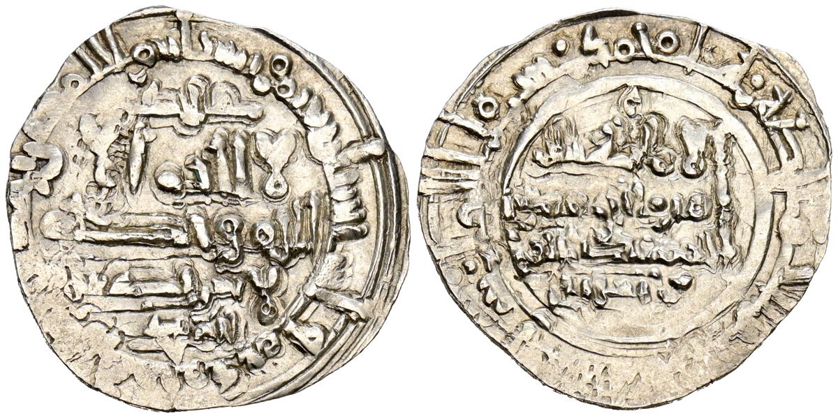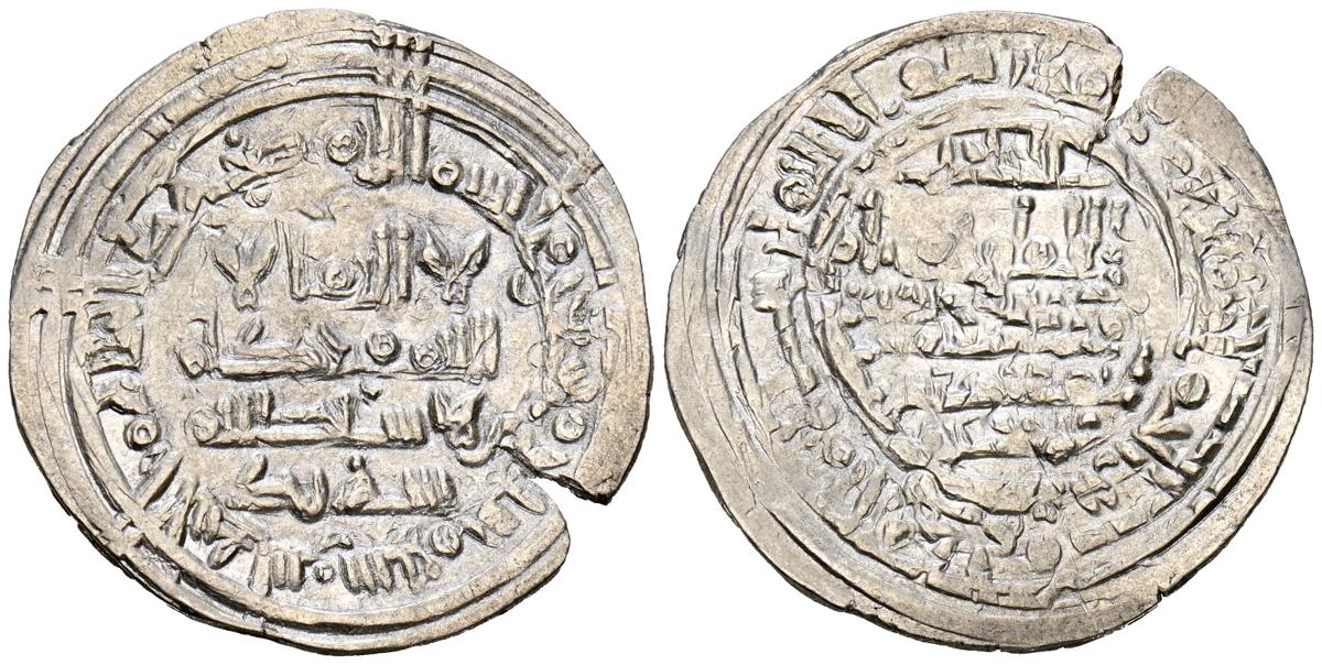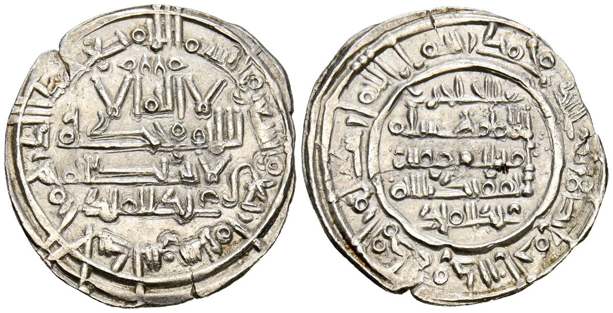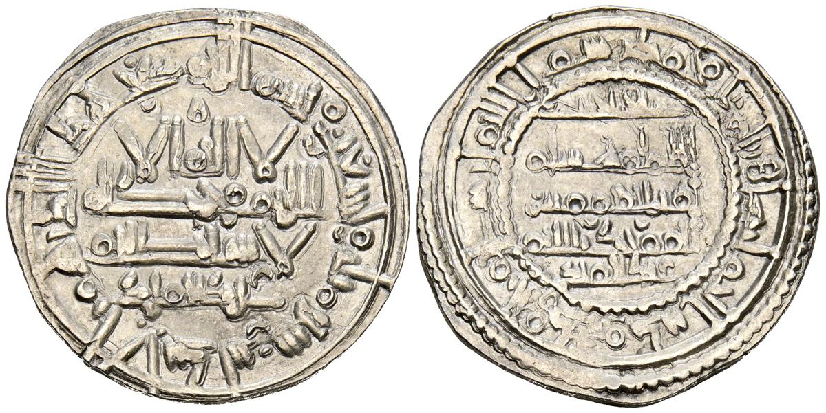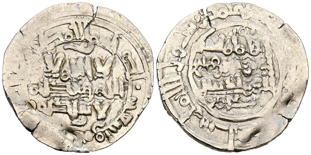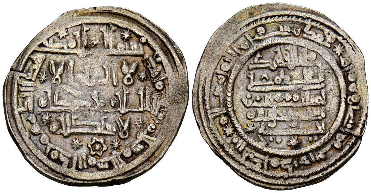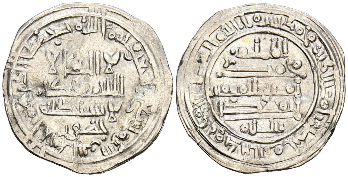 CALIFATO DE CORDOBA, Hisham II. Dirham. (Ar. 3,55g/24mm). 389H. Madinat Fas (Fez) / مدينة فاس. (Vives 622). Citando a 'Abd Allāh / عبداللة en IA. y 'Āmir / عامر en IIA. MBC+. Acuñación muy cuidada para esta ceca. Extraordinario y muy raro ejemplar.
