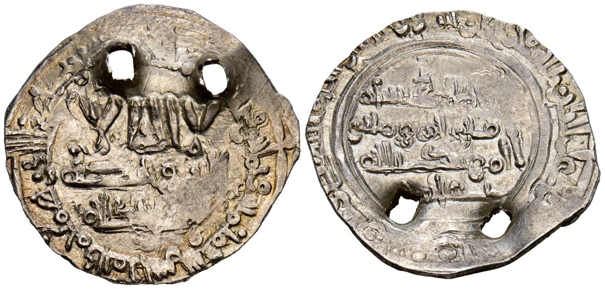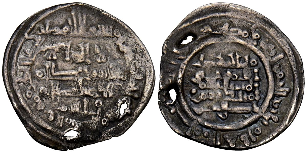 CALIFATO DE CÓRDOBA, Hisham II. Dirham. (Ar. 2,63g/24mm). 388H. Madinat Fas (Fez) / مدينة فاس. (Vives 610). Citando a Mohammad / محمد en IA. y 'Āmir / عامر en IIA. MBC-. Perforaciones. Interesante y escaso ejemplar.