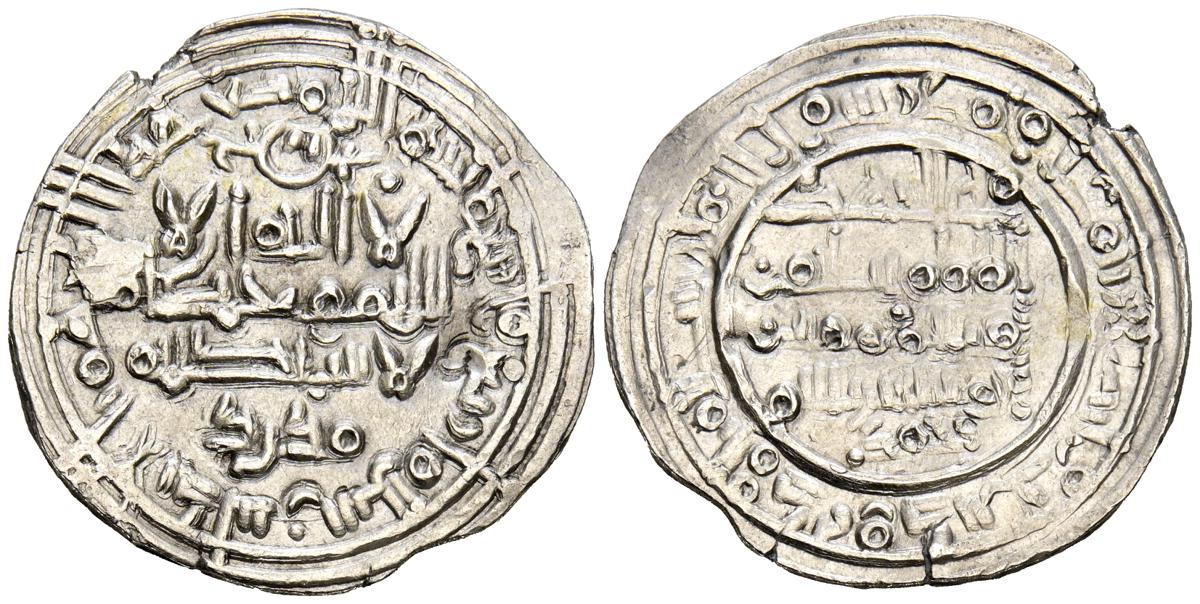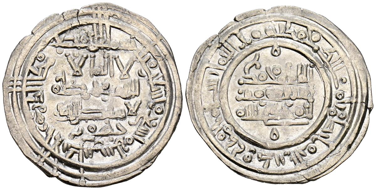 CALIFATO DE CÓRDOBA, Suleyman (2° reinado). Dirham. (Ar. 3,96g/23mm). 404H. al-Ándalus / الاندلس. (Vives 798; Prieto 25a). Citando a Mudrik / مدرك en IA. y al Príncipe Heredero Mohammad : محمد / ولى العهد en IIA. EBC. Rayitas y pequeño exceso de meta l en anverso. Aun así precioso y muy raro ejemplar.