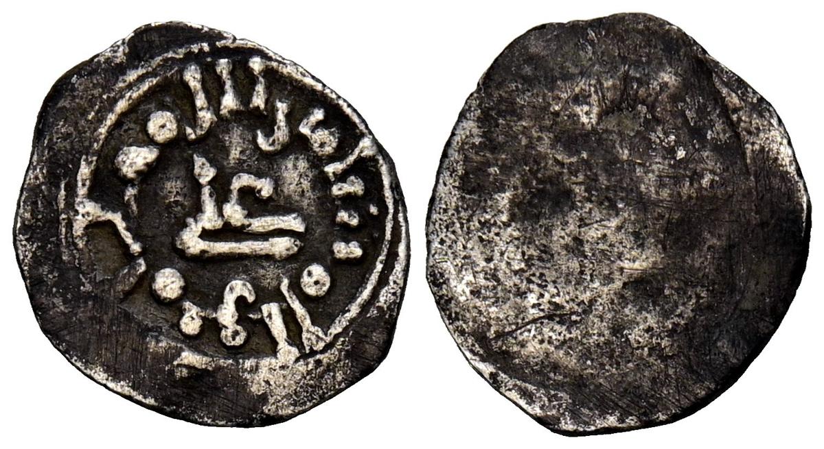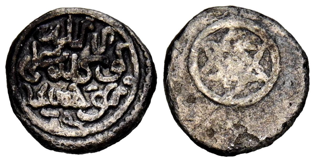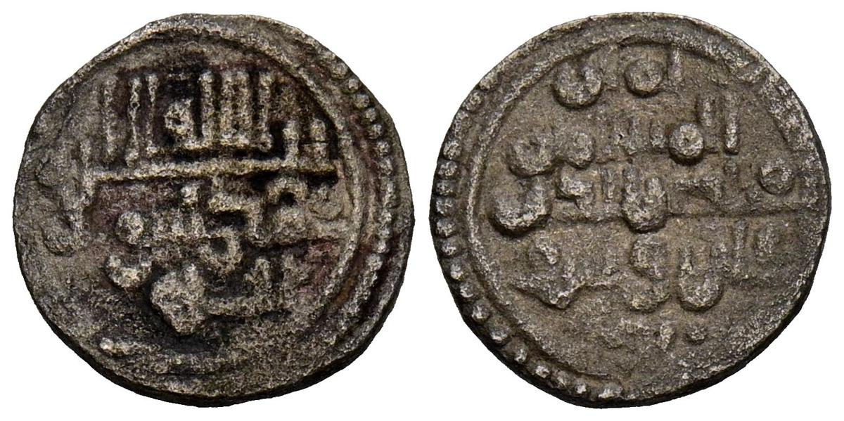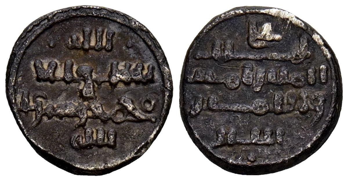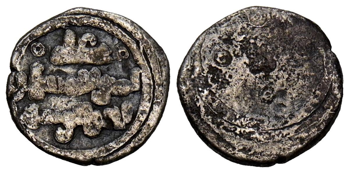 ALMORAVIDES. Ali ben Yusuf y el Emir Sir (522-533H.). Quirate. (Ar. 0,64g/13mm). S/D. (Vives no cita; Eustache 341A (lectura parcial); Benito Cf12). Anv: Shahada' en tres líneas y mención al heredero: الامير سير. Rev: En el centro: الله/ حسبي (Dios m e basta), alrededor se presenta a Ali con los títulos de Amir al-Muslimin y Nasir al-Din. MBC/MBC+. Vano. Muy raro.