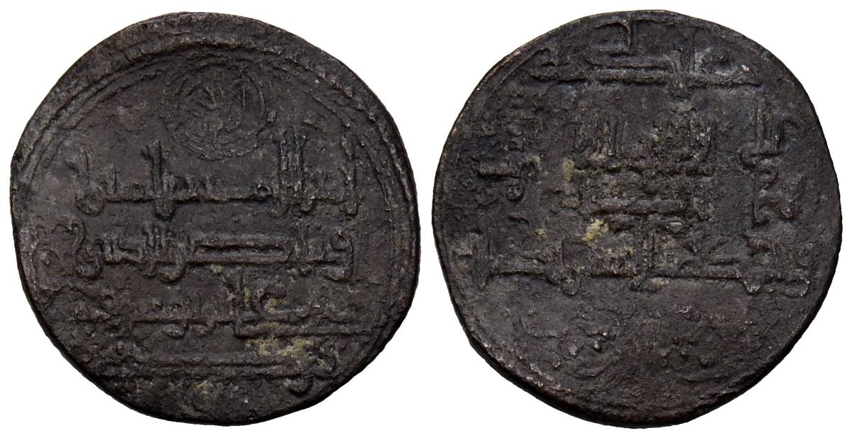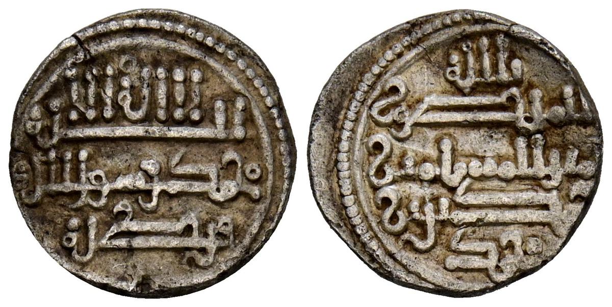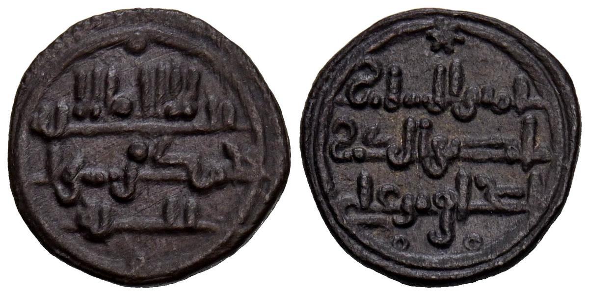 ALMORAVIDES, Ibn Malik. Quirate. (Ar. 0,90g/12mm). S/D. (Vives 1919; Delgado XVIII-25; Canto e Ibrahim 677; Benito K2;). Anv: Con caligrafía nasjí, 'Shahadah' en tres líneas, debajo cita al propio Ibn Malik / ابن مالك. Rev: En cúfico ornamental, reco nocimiento al califa de oriente: امير / المؤمنين / العبا سي. MBC+. Preciosa pátina. Muy raro e interesante ejemplar.