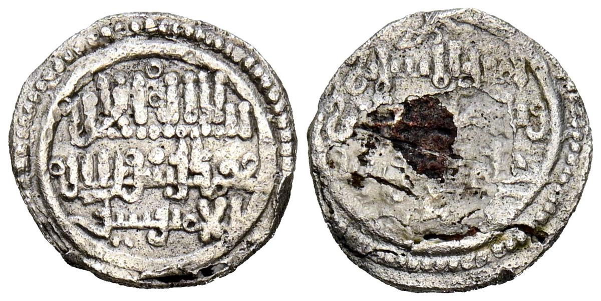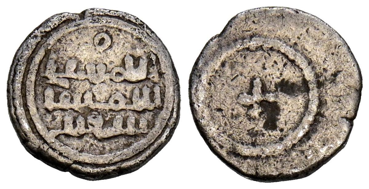 ALMORAVIDES. Ali ben Yusuf (500-537H.). 1/2 Quirate. (Ar. 1,11g/15mm). Córdoba / قرطبة. (Vives 1706; Hazard 965; Benito Cc1). Anv: 'Shahada' en tres líneas, rodeando orla en cuadrado: محمد / عبده / ورسوله (Muhammad, su sirvo, y su mensajero). Rev: Presenta a Ali con los títulos de Amir al-Muslimin y Nasir al-Din, arriba dentro de círculo jaculatorio: نصره الله (que Dios le ayude), abajo ceca: قرطبة. MBC. Pátina oscura. Muy raro.