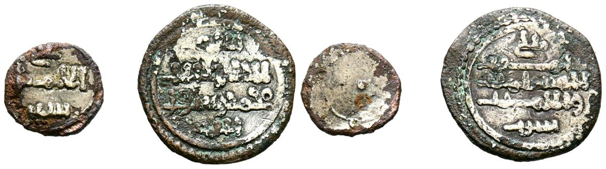 ALMORAVIDES. Interesante pareja de falsificaciones de época a nombre de Alí Ibn Yusuf y el Emir Sir (522-533H). Quirate (Vives 1768; Hazard 976; Benito Cf8) y 1/2 quirate (Benito Cd3). Diferentes medidas y estados de conservación. A EXAMINAR.