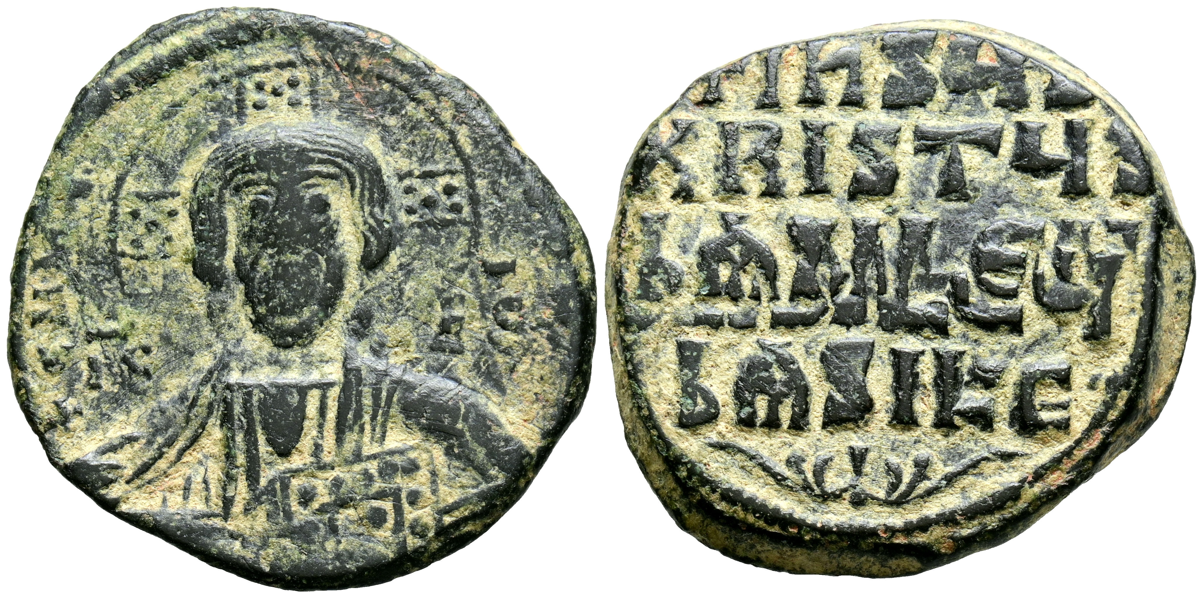 ANONIMO, atribuído a Basilio II y Constantino VIII. Follis. (Ae. 12,84g/30mm). 867-886 d.C. Constantinopla. (Seaby 1818). Anv: Busto coronado de Cristo, alzando mano derecha y con libro en mano izquierda, alrededor leyenda. Rev: Leyenda en cuatro líneas. MBC.