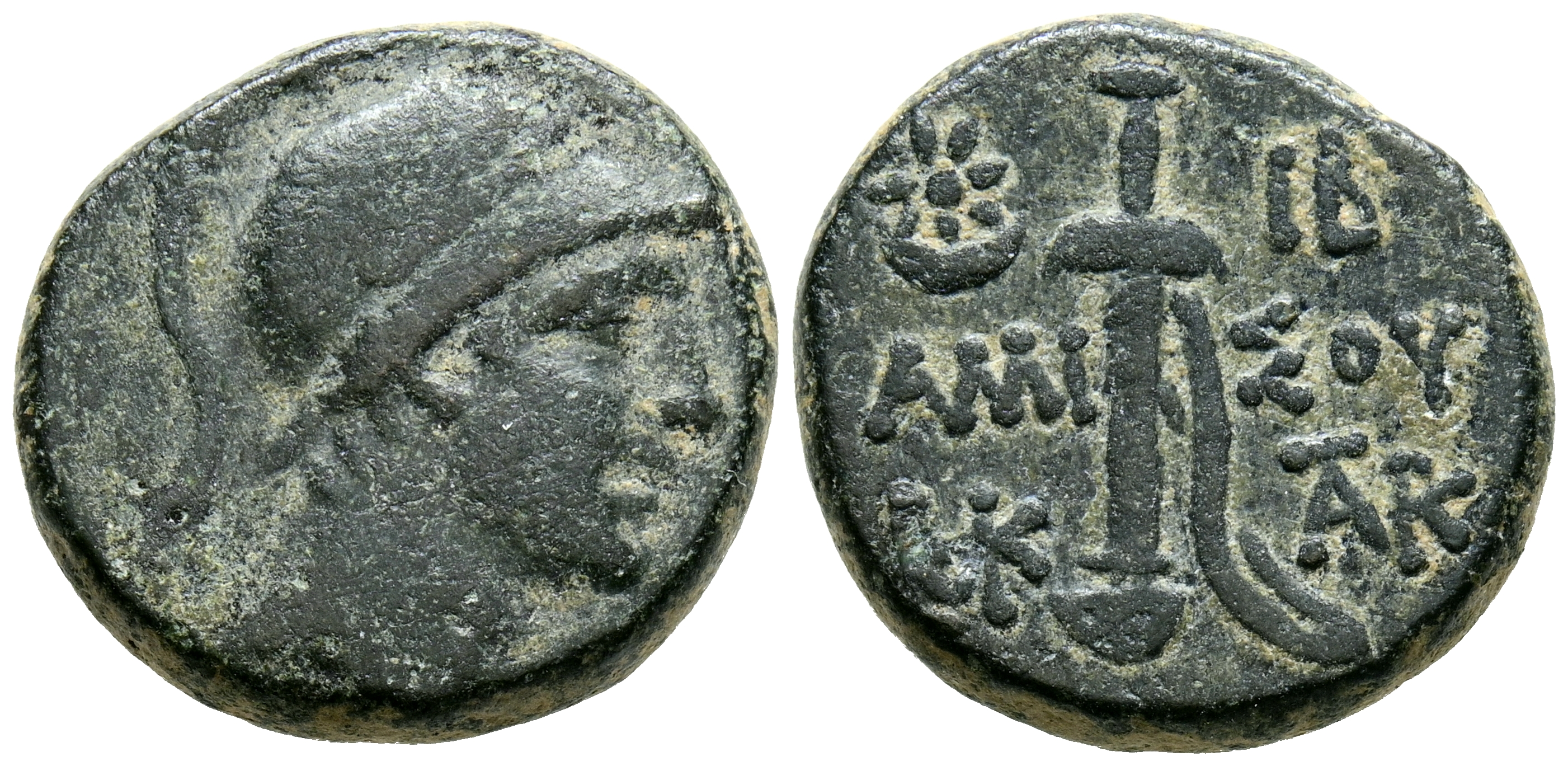 PONTOS, Amisos. Ae18. (Ae. 7,68g/20mm). 111-105 a.C. (BMC 48). Anv: Cabeza con casco de Ares. Rev: Espada en vaina, entre leyenda griega: AΜΙ-ΣΟΥ y debajo, monogramas. MBC.