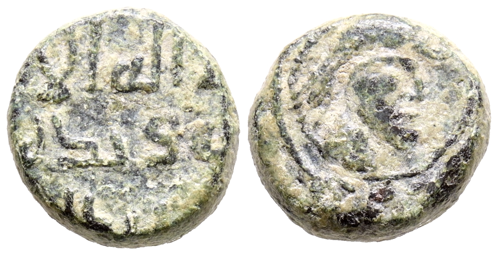 EMIRATO DEPENDIENTE DE CÓRDOBA, ÉPOCA DE LOS GOBERNADORES. Anónimo. Felús. (Ae. 2.14g/6mm). S/D. (Frochoso XIV-a; Walker-Th12). Obv: 'Sahada' en tres líneas rodeadas por un abalorio de hojas. Rev: Cabeza de guerrero mirando hacia la derecha, rodeada por la misión profética de Muhammad. MBC.