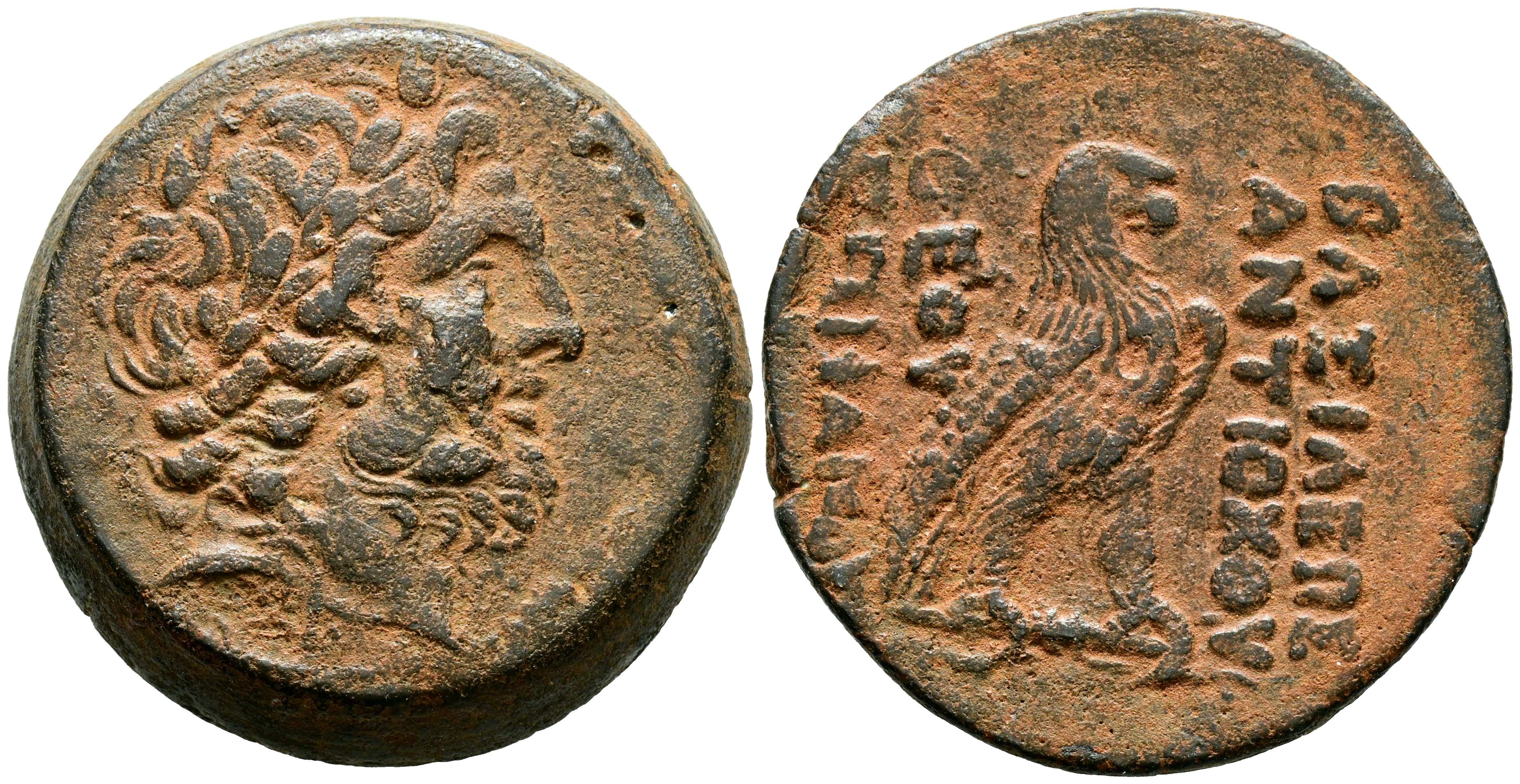 REINO SELEUCIDA, Antiochos IV Epiphanes. Ae33. (Ae. 35,15g/33mm). 169-168 a.C. Antioquía del Orontes. (Seaby 1413). Anv: Cabeza laureada de Zeus a derecha. Rev: Aguila estante sobre rayo a derecha, alrededor leyenda: BAΣIΛEΩΣ / ANTIOXOY - ΘEOY / EΠIΦ ANOYΣ. MBC+. Pátina artificial.