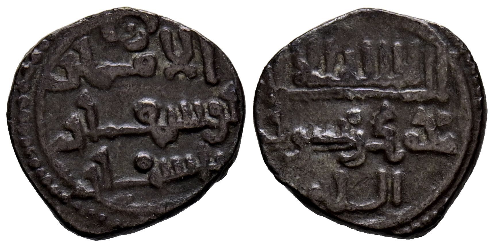 ALMORAVIDES, Yusuf ben Tashfin (480-500H). Quirate. (Ar. 0,81g/12mm). S/D. (Vives 1535; Benito Ba12). Anv: 'Shahada' en cuatro líneas. Rev: Presenta a Yusuf sin títulos ni heredero. MBC. Pátina oscura. Escasa. Ex Jesus Vico, Subasta 166 (22/2/2023) Colección Gaspariño, Lote 585.