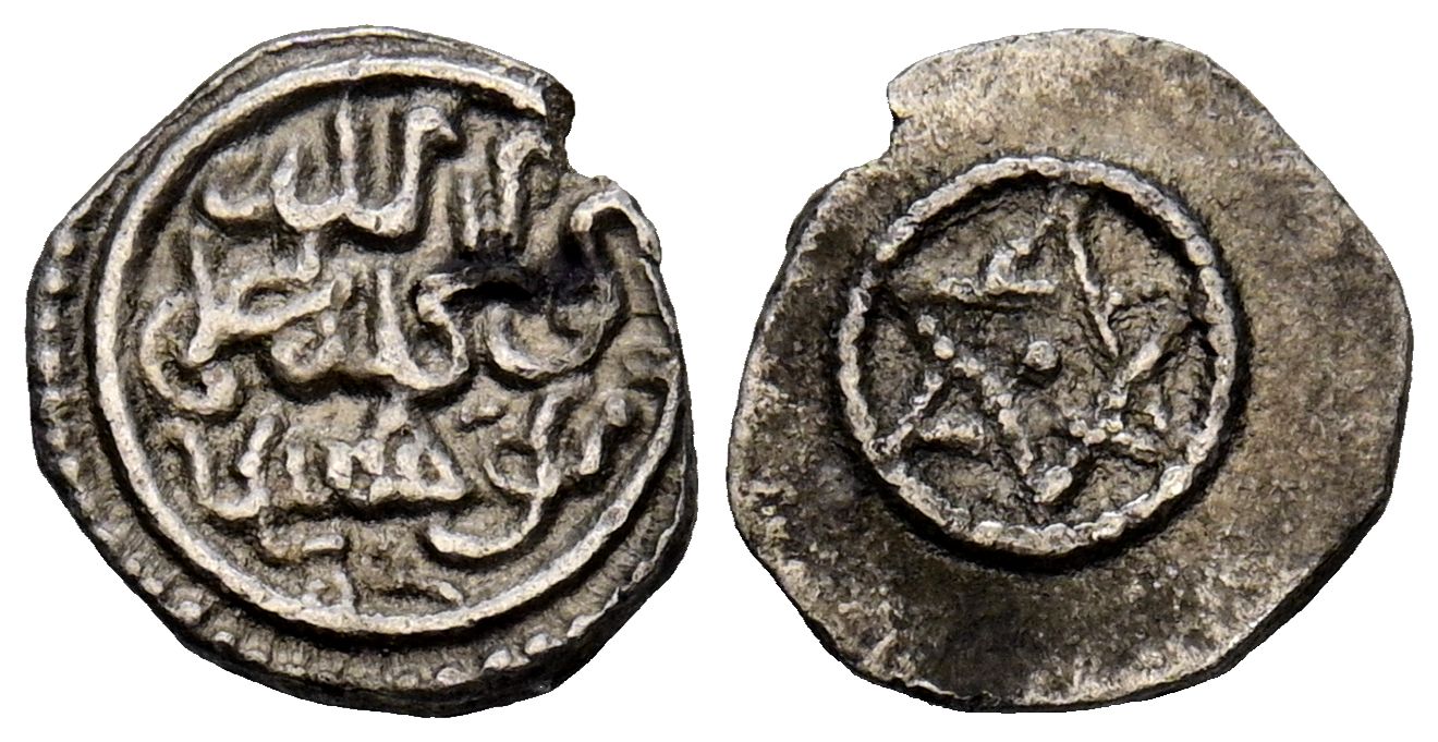 ALMORAVIDES. Anónima. 1/2 Quirate. (Ar. 0,43g/9mm). S/D. Anv: هو حسبي / توكلت على / الله (Confio en Dios, Él me basta). Rev: Sello de Salomón rodeado. EBC-. Rarísima. Pendiente de incorporación al catálogo de Benito de Mozos.
