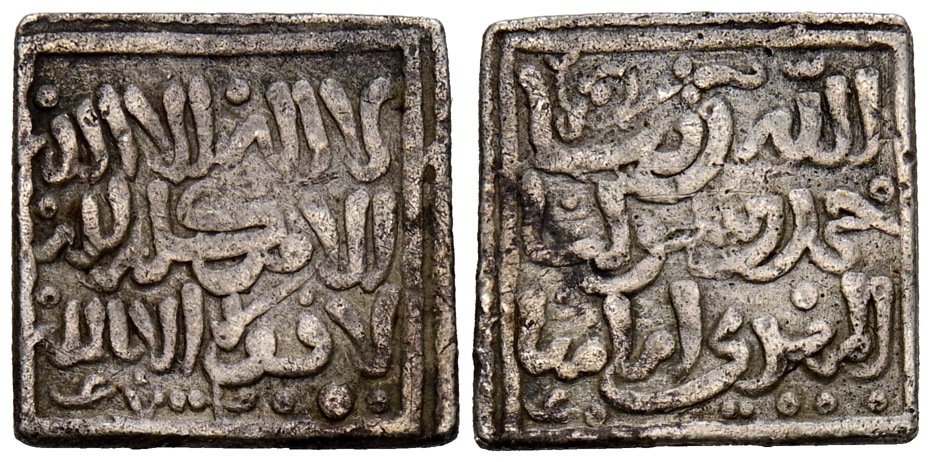 ALMOHADES. Anónimo a nombre del imán Al-Mahdi. Dirham, copia africana de época. (Ar. 1,38g/13mm). Fez / فاس. (Tipos: Vives 2107 y Hohertz 601b). MBC. Alabeada. Interesante pieza para estudio. Singularmente, además de los típicos roeles, esta pieza co ntiene en la esquina inferior izquierda de ambas áreas, un diminuto adorno en forma de ''ʿayn'' inicial y que posiblemente se trate de una marca de conteo.