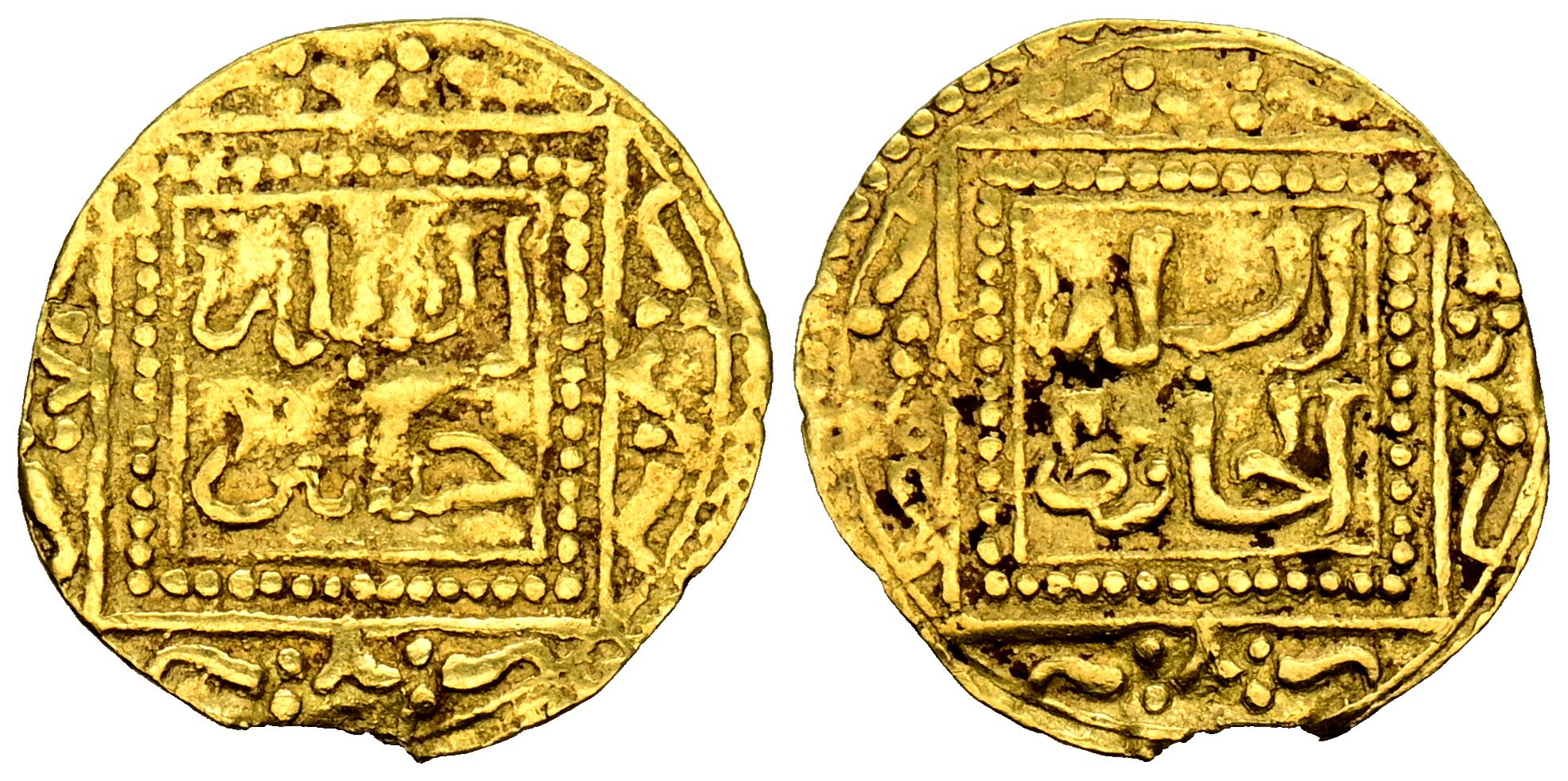 TAIFAS ALMOHADES. Anónimo atribuído a los Ban Hud. 1/8 de Dinar. (Au. 0,55g/14mm). S/D. (Vives no cita). Anv: حسبنا / الله (Dios me basta). Rev: الحافظ/ الله (Dios es el guardián). MBC-. Rotura al borde. Muy rara.Ex Jesús Vico, Subasta 142 (11/06 /2015), Nº lote 309.