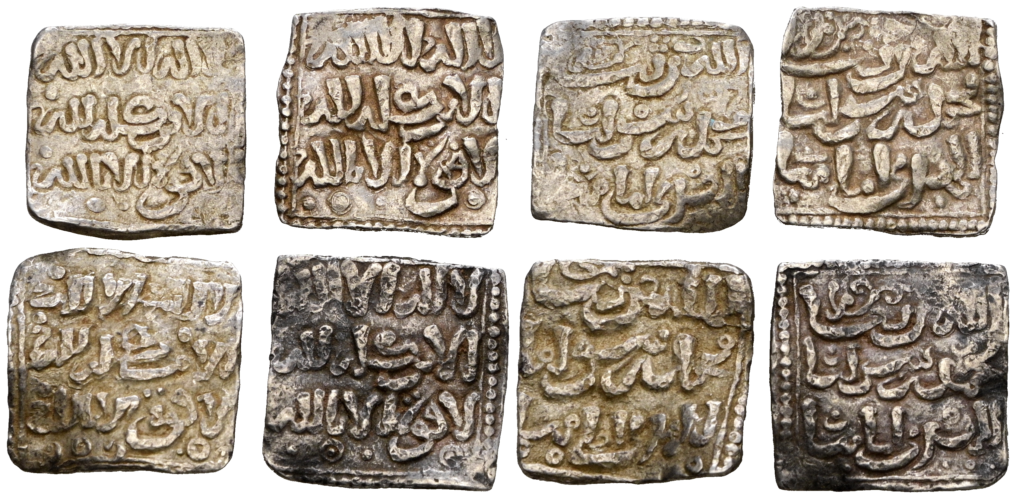 ALMOHADES. Conjunto de 4 dirhams anónimos citando a Al-Mahdi. A destacar, la curiosa variedad de adornor florales en lugar de las cecas y su buen relieve. Diferentes medidas y estados de conservación. A EXAMINAR.