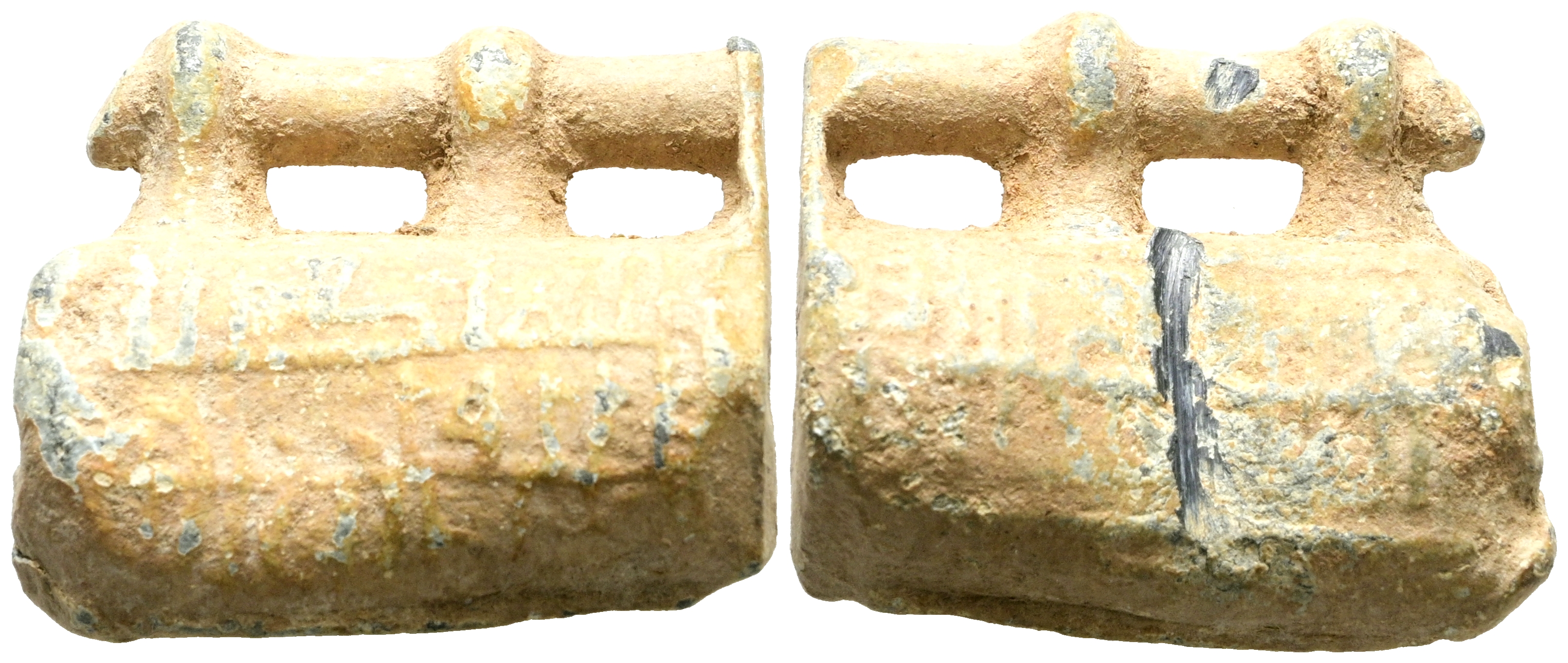 PERIODO CALIFAL O POSTERIOR. Amuleto-estuche. (Pb. 21,81g/28x24mm). Posiblemente Siglo X-XII. Estuche de plomo en forma cilíndrica de tapa oval y dos anillas de sujeción afrontadas en la parte superior unidas por una espiga. La decoración se basa en seis bandas epigraficas diagonales y realizadas en cufico dsimple que rodean el cuerpo central de la pieza. (Similar a un Amuletos 219-224. Tipo B-Tubos-de dos asas). MBC+.