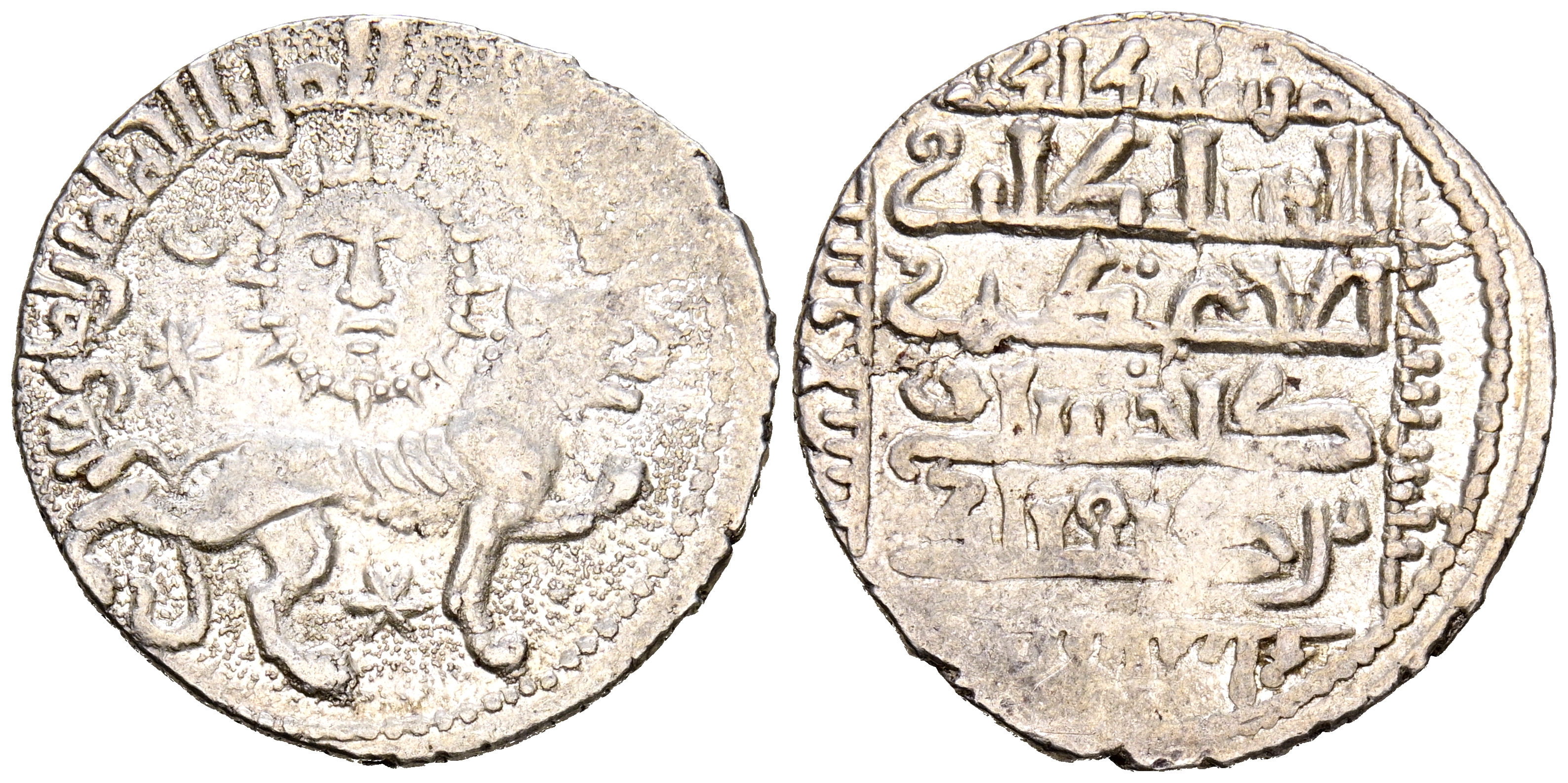 SELYUQUÍES DE RUM, Ghiyath al-Din Kay Khusraw II bin Kay Qubadh (634-644H). Dirham. (Ar. 2,98g/22mm). 639H. Siwas. Anv: León avanzando hacia la derecha entre dos estrella y creciente, personificación del sol arriba, alrededor leyenda en forma de arco. Rev: Leyenda central en 4 lineas y orla cuadrada. (Álbum 1218). MBC+. Escaso.