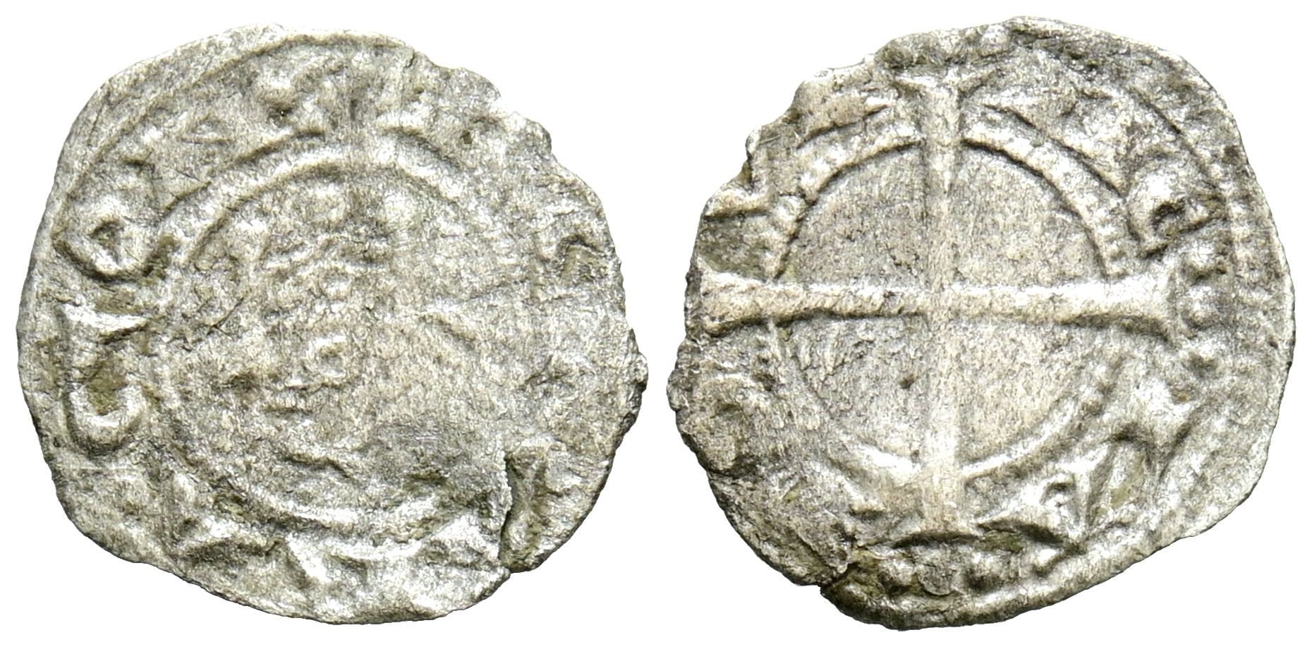 ALFONSO I (1213-1276). Óbolo. (Ve. 0,24g/13mm). Marsella, Condado de la Provenza. (Cru V.S. 171; Cru C.G. 2105). Anv: Busto coronado de Alfonso I a izquierda dentro de una gráfila circular, alrededor leyenda: REX ARA GONE. Rev: Cruz pasante con tres puntos en los extremos, alrededor leyenda: PO VI NC IA. MBC/MBC-. Rara.
