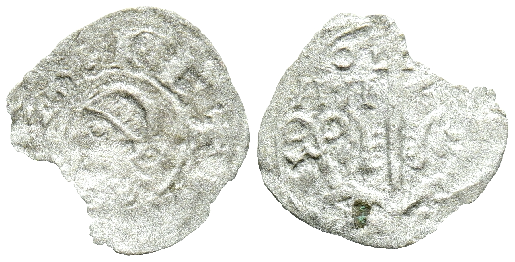 PEDRO EL DE HUESCA (1094-1104). Óbolo. (Ve. 0,13g/12mm). Jaca (Huesca). (Crus V.S. 214.1). Anv: Busto de Pedro a izquierda, alrededor leyenda: PETRVS REX. Rev: Árbol superado de cruz, a los lados leyenda: ARA-GON. BC+/MBC-. Limpiada y falta en cospel. Rara.
