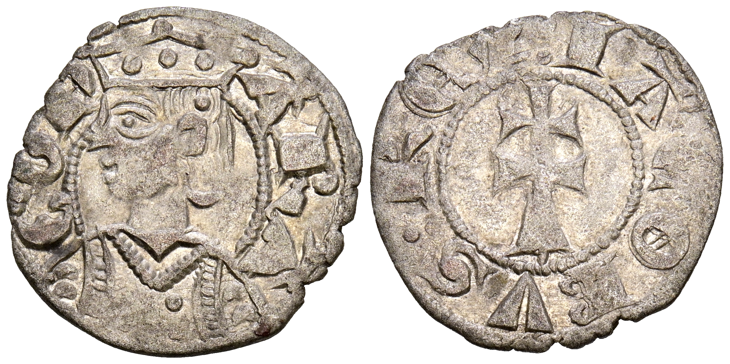 JAIME I (1213-1276). Dinero. (Ve. 1,07g/17mm). Aragón. (Cru.V.S. 318). Anv: Efigie coronada a izquierda, alrededor leyenda: ARAGON. Rev: Cruz patriarcal, alrededor leyenda: IACOBVS REX. MBC+.