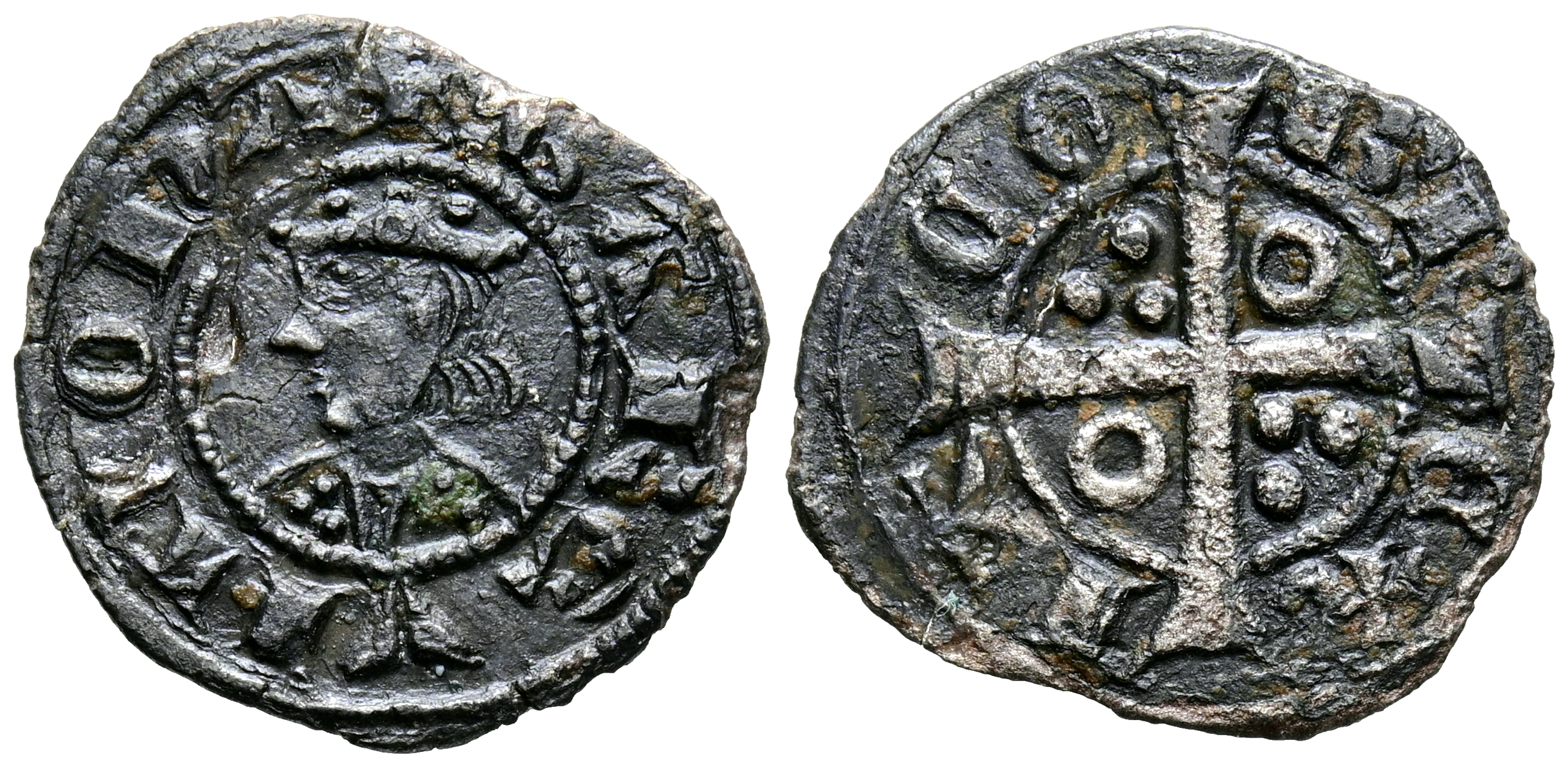JAIME II (1291-1327). Dinero. (Ve. 0,98g/18mm). Barcelona. (Cru V.S. 340). Anv: Busto coronado de Jaime II a izquierda, alrededor leyenda: BARQINONA. Rev: Cruz patada con tres puntos en el 1º y 4º cuadrante y roel en el 2º y 3º, alrededor leyenda: IACOB REX. MBC-. Fractura reparada.