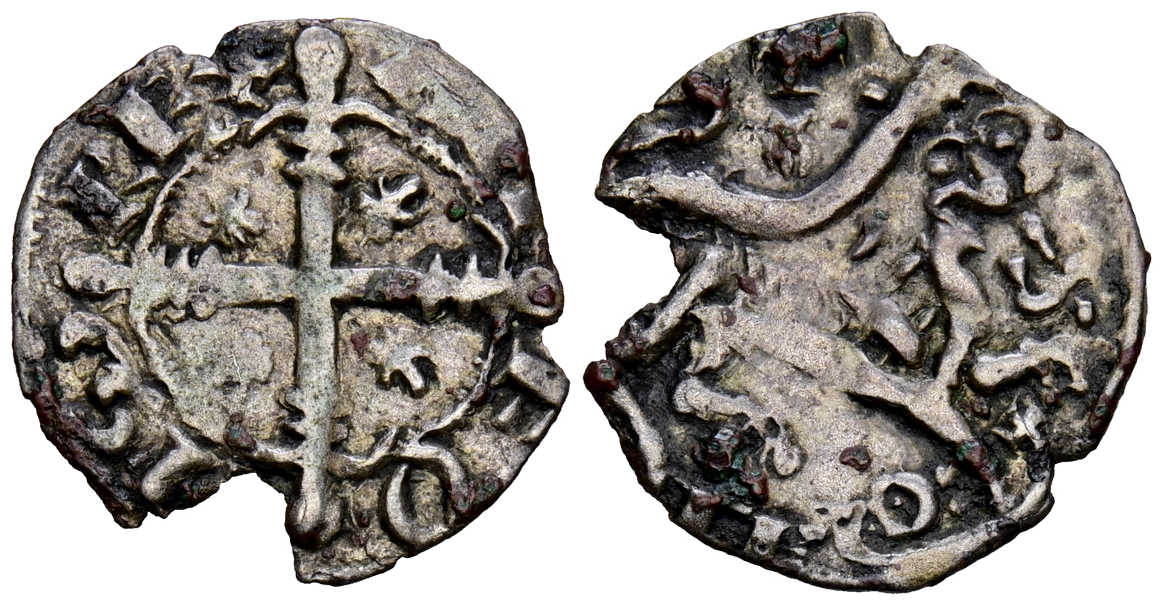 ALFONSO IX (1188-1230). Dinero. (Ar. 0,73g/16mm). Santiago de Compostela. (Imperatrix A9:5.15; FAB-130.3). Anv: Cruz floreada y veneras en los cuarteles, alrededor leyenda: ANFONS REX. Rev: León a derecha, encima cruz potenzada y venera, debajo: LEO, delante entre las patas: SI (superpuestas) y cruz potenzada. MBC. Cospel faltado. Escaso ejemplar.