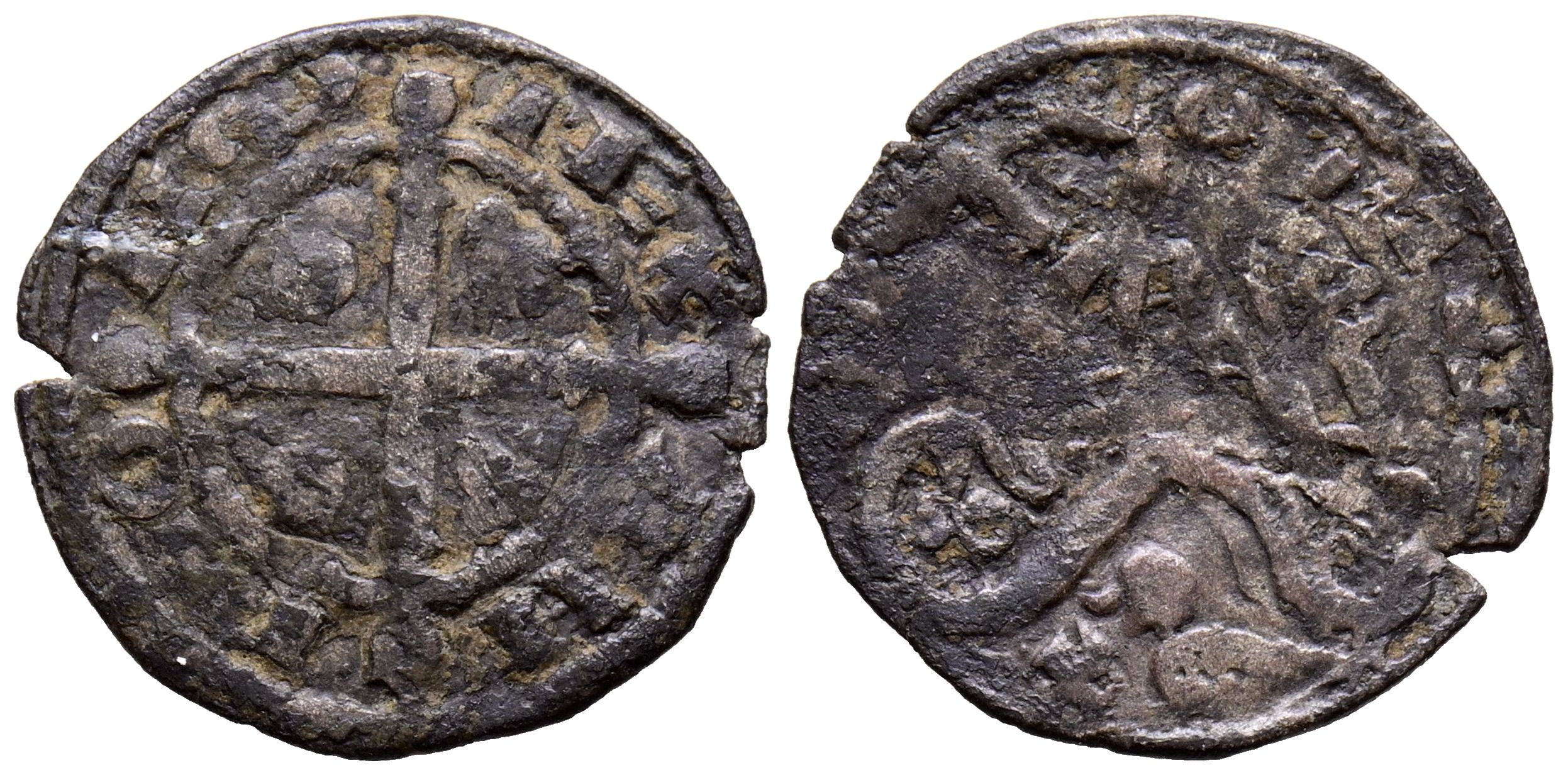 ALFONSO IX (1188-1230). Dinero de la Corte de Benavente. (Ve. 0,82g/17mm). Taller inderminado, sin marca. (Imperatrix A9:5.49 var; FAB-131.1). Anv: Cruz floreada y veneras en los cuarteles, alrededor leyenda: ANFONS REX. Rev: León a derecha con creciente entre las patas, encima Cruz y venera, debajo leyenda: LEO. MBC-. Escaso.