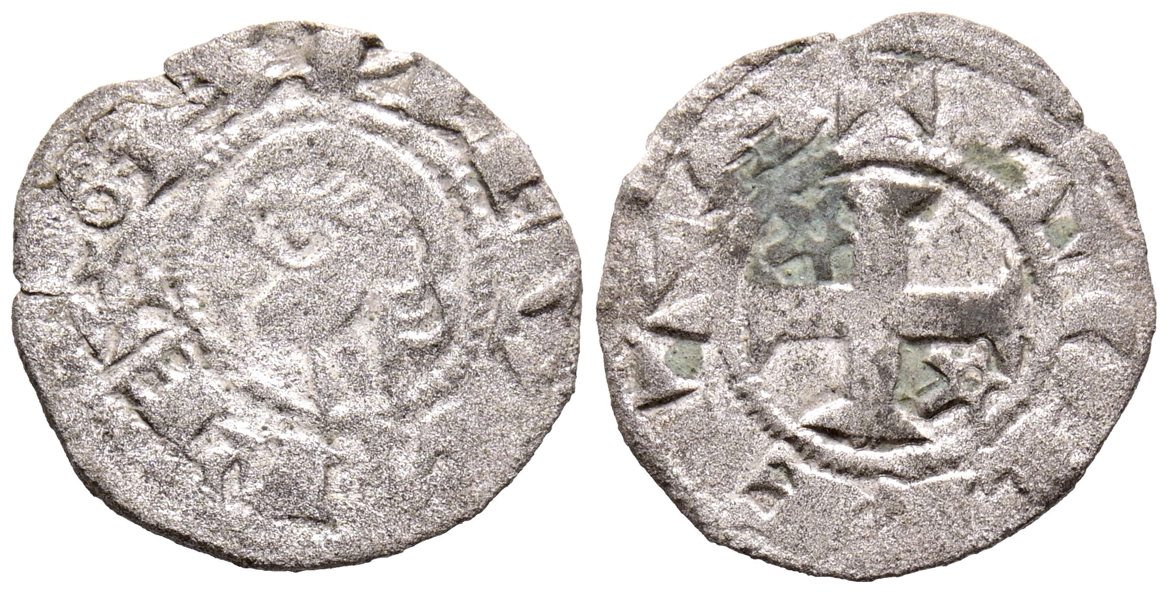 ALFONSO VIII (1158-1214). Dinero. (Ve. 0,81g/17mm). Taller itinerante de batalla. (Imperatrix A8:29.9; FAB-25.3 como Alfonso I de Aragón). Anv: Busto a izquierda dentro de gráfilar circular, alrededor leyenda: ANFVS REX. Rev: Cruz patada con roel estrellado en primer y cuarto cuadrante, todo dentro de una gráfila circular, alrededor leyenda: TOLLETA. MBC.