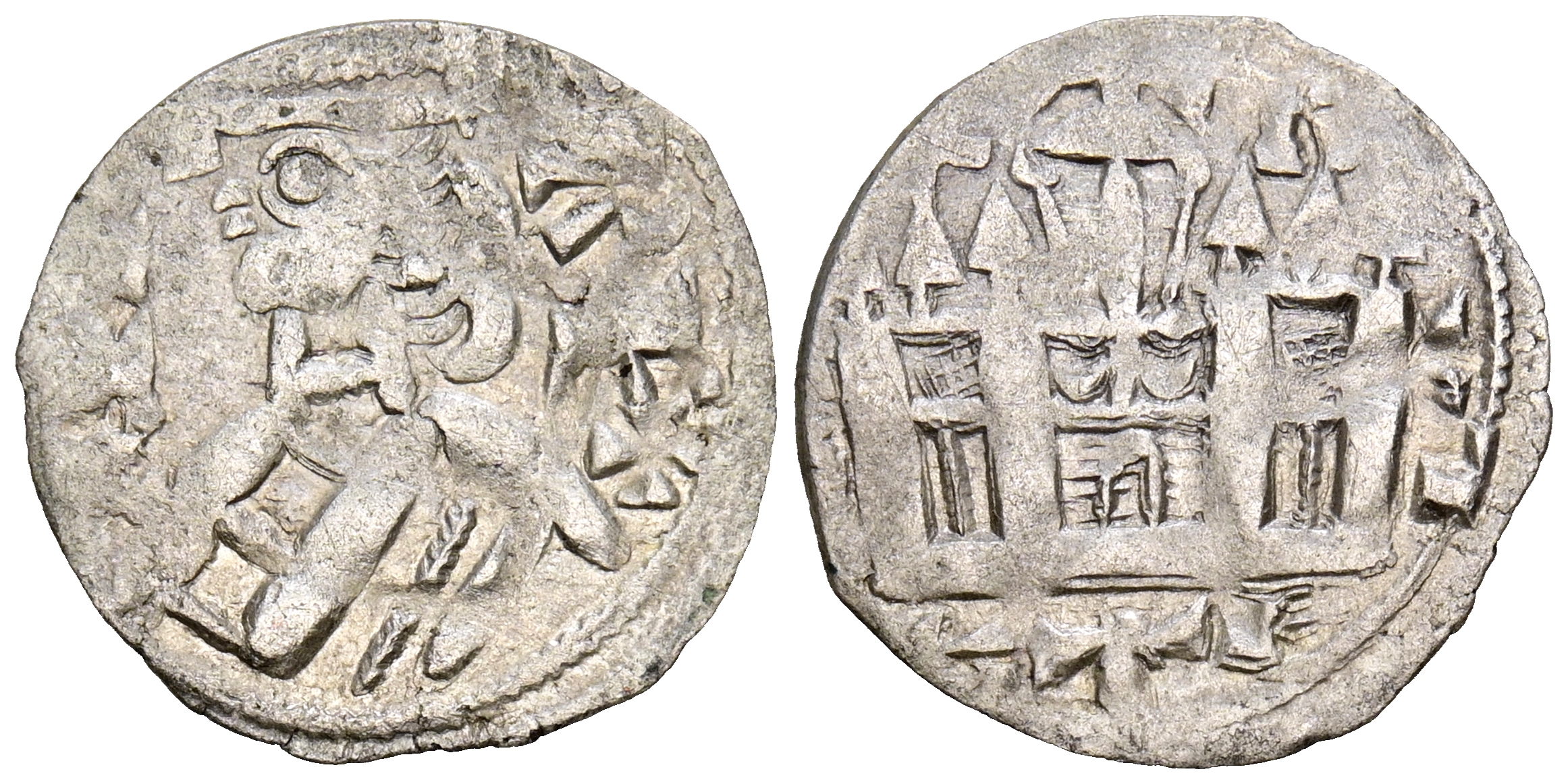 ALFONSO VIII (1158-1214). Dinero. (Ve. 0,66g/16mm). Burgos. (Imperatrix A8:36.1; FAB-205). Anv: Busto coronado de Alfonso VIII a izquierda, alrededor leyenda: ANFVS REX. Rev: Castillo con cruz central adornada, a la izquierda estrella, a la derecha B, alrededor leyenda: CASTELE. MBC. Limpiada.