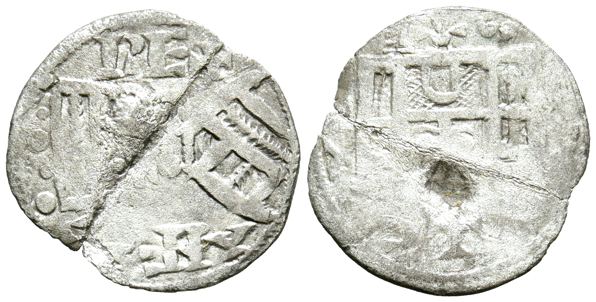 ALFONSO VIII (1158-1214). Dinero. (Ve. 0,71g/17mm). Calahorra. (Imperatrix A8:36.26; FAB-196). Anv: Busto coronado de Alfonso VIII a izquierda, alrededor leyenda: ANFVS REX. Rev: Castillo con cruz central adornada, a la izquierda estrella, a la derecha C, alrededor leyenda: CASTELE. MBC-. Marca de doblez.