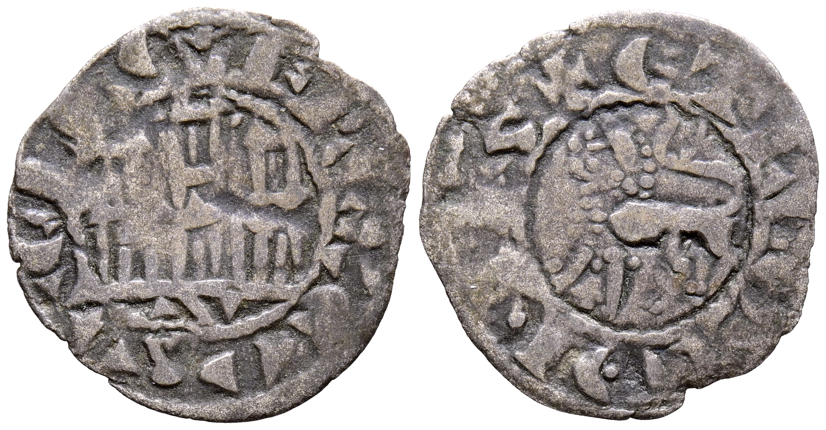 INFANTE DON ENRIQUE (1259). Dinero. (Ve. 0,57g/19mm). Sevilla. (Imperatrix ES:1.3; FAB-292.1). Anv: Castillo, debajo: S, dentro de gráfila circular de puntos, alrededor leyenda: E REX CASTE. Rev: León estante a izquierda dentro de gráfila circular, alrededor leyenda: E REX LEGIO. MBC. Escasa.