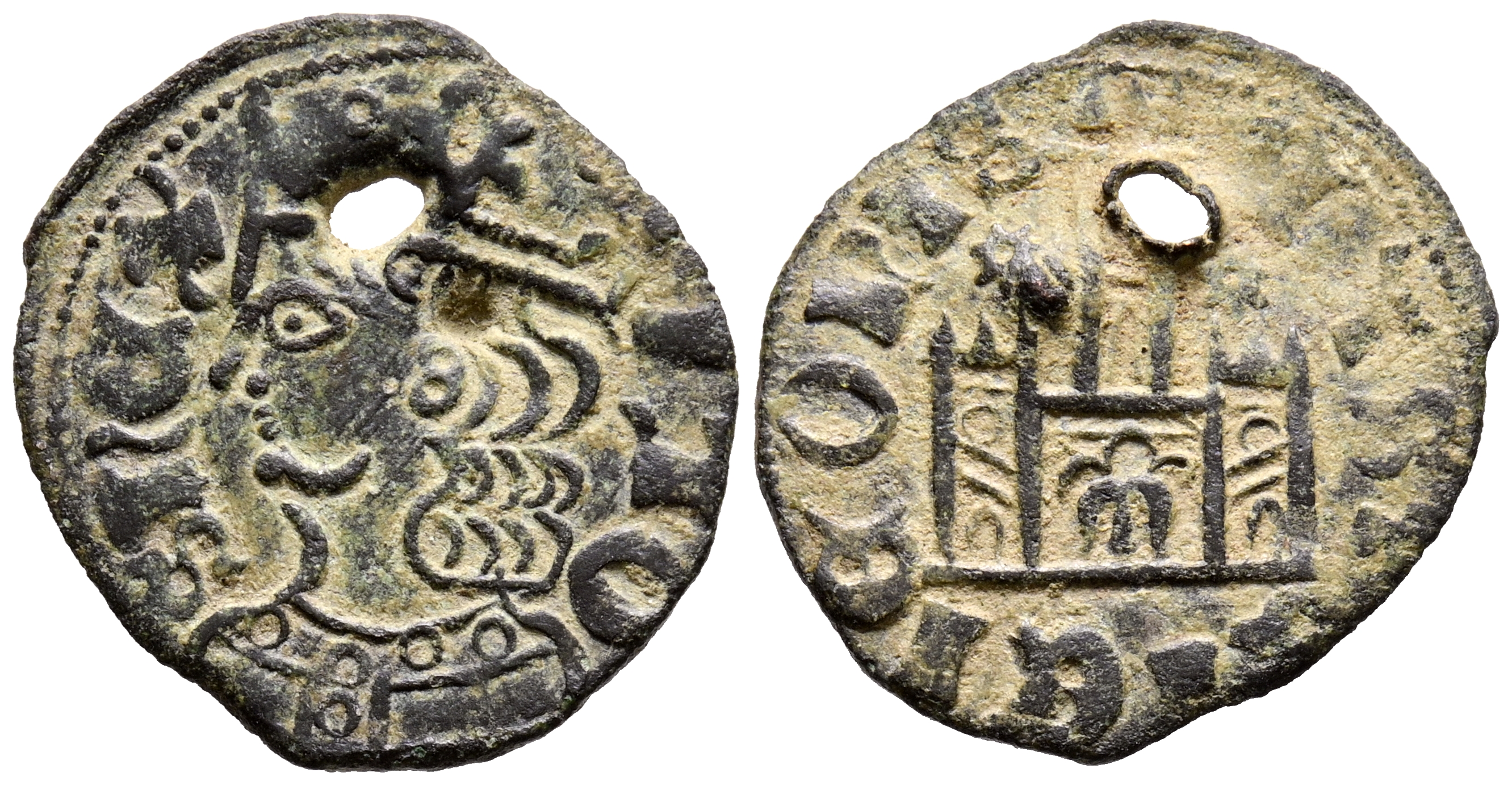 ALFONSO XI (1312-1350). Cornado falso de época. (Ve. 1,19g/19mm). Murcia. (Imperatrix Del A11: 2.10, mismo ejemplar; FAB-339.2 sim). Anv: Busto coronado de Alfonso XI a la izquierda, alrededor leyenda: ALFONS REX. Rev: Castillo, en la puerta marca de ceca: M, sobre las dos torres del castillo anillos estrellados, alrededor leyenda: CASTELLE ET GIEOENIS. MBC. Perforado. Atractivo ejemplar.