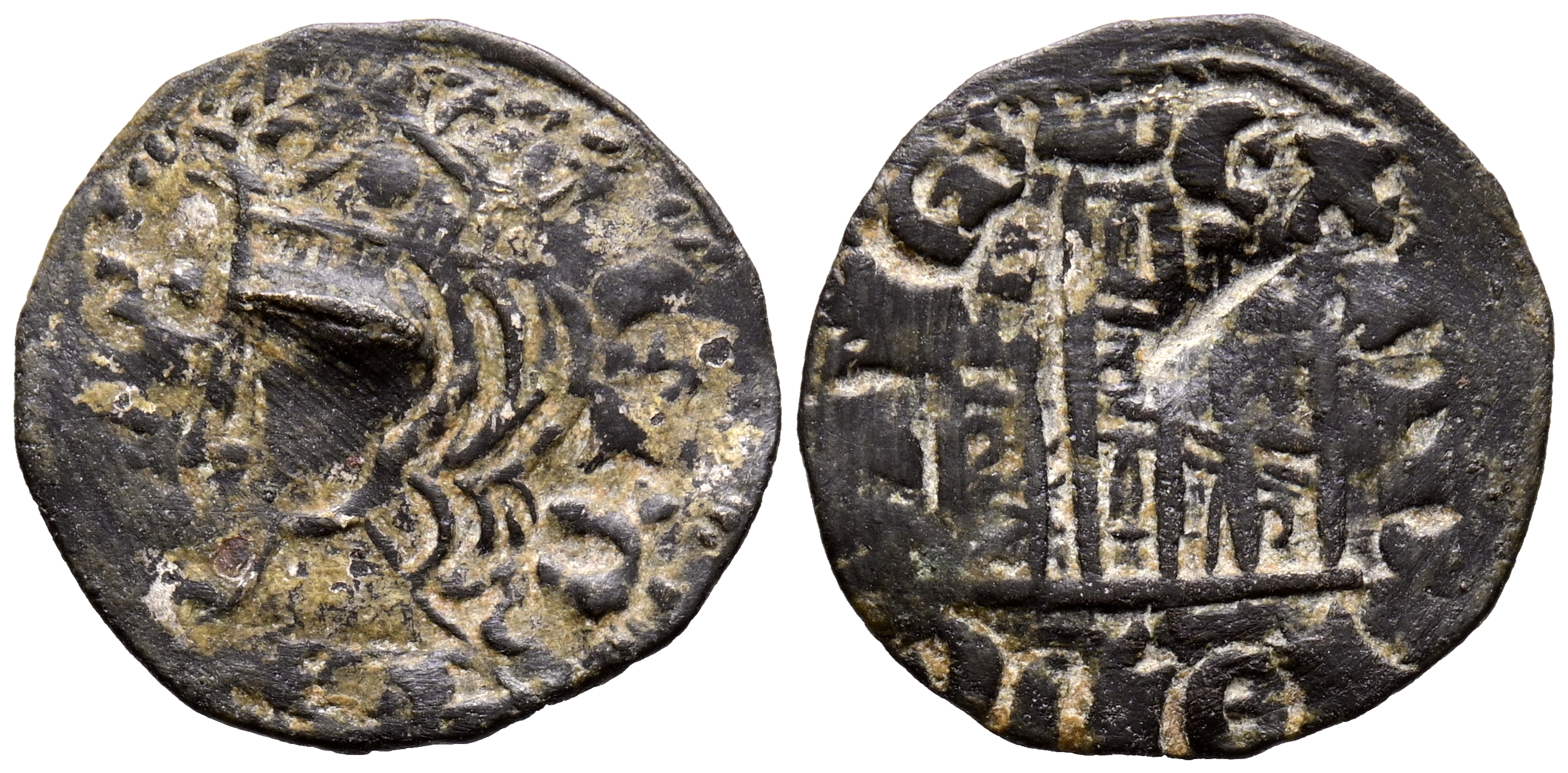 ALFONSO XI (1312-1350). Cornado falso de época. (Ve. 1,04g/19mm). Indeterminada. (Tipo FAB-334). Anv: Busto coronado de Alfonso XI a la izquierda, alrededor leyenda: ALFONS REX. Rev: Castillo, en la puerta marca de ceca: M, sobre las dos torres del castillo anillos estrellados, alrededor leyenda: CASTELLE ET GIEOENIS. MBC. Perforado. Atractivo ejemplar con restos del plateado original.