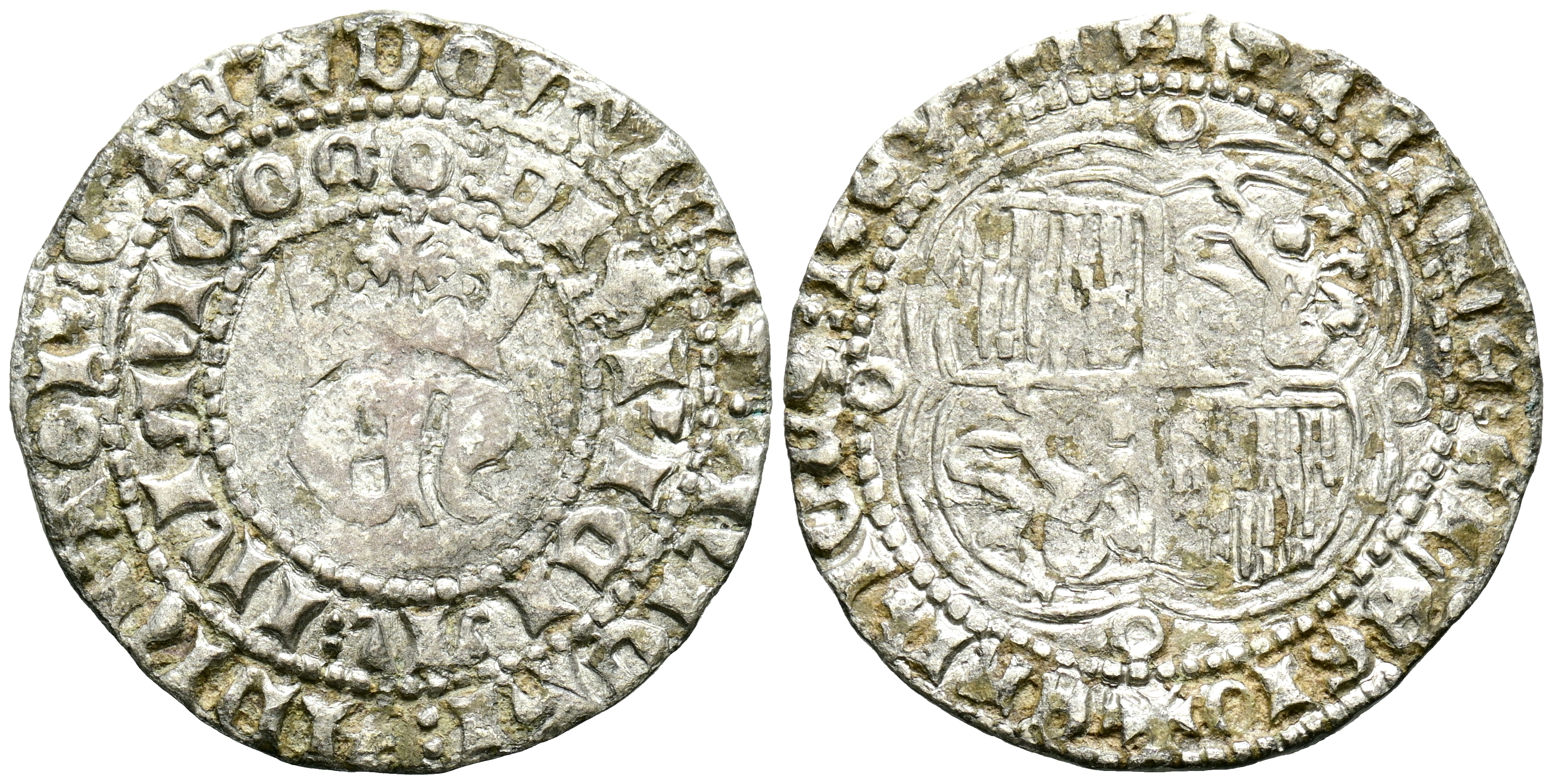 ENRIQUE II (1368-1379). Real de Vellón. (Ae. 2,77g/26mm). Sin ceca. (Imperatrix E2:2.24; FAB-415). Anv: Anagrama EN coronado, alrededor leyenda en doble orla: DOMINVS MICHI ADIVTOR ET EGO DISPICIAM INIMICO. Rev: Cuartelado de castillos y leones rampantes a izquierda dentro de gráfila lobular, alrededor leyenda: ENRICV REX CASTELLE E LEGIONIS. MBC+.