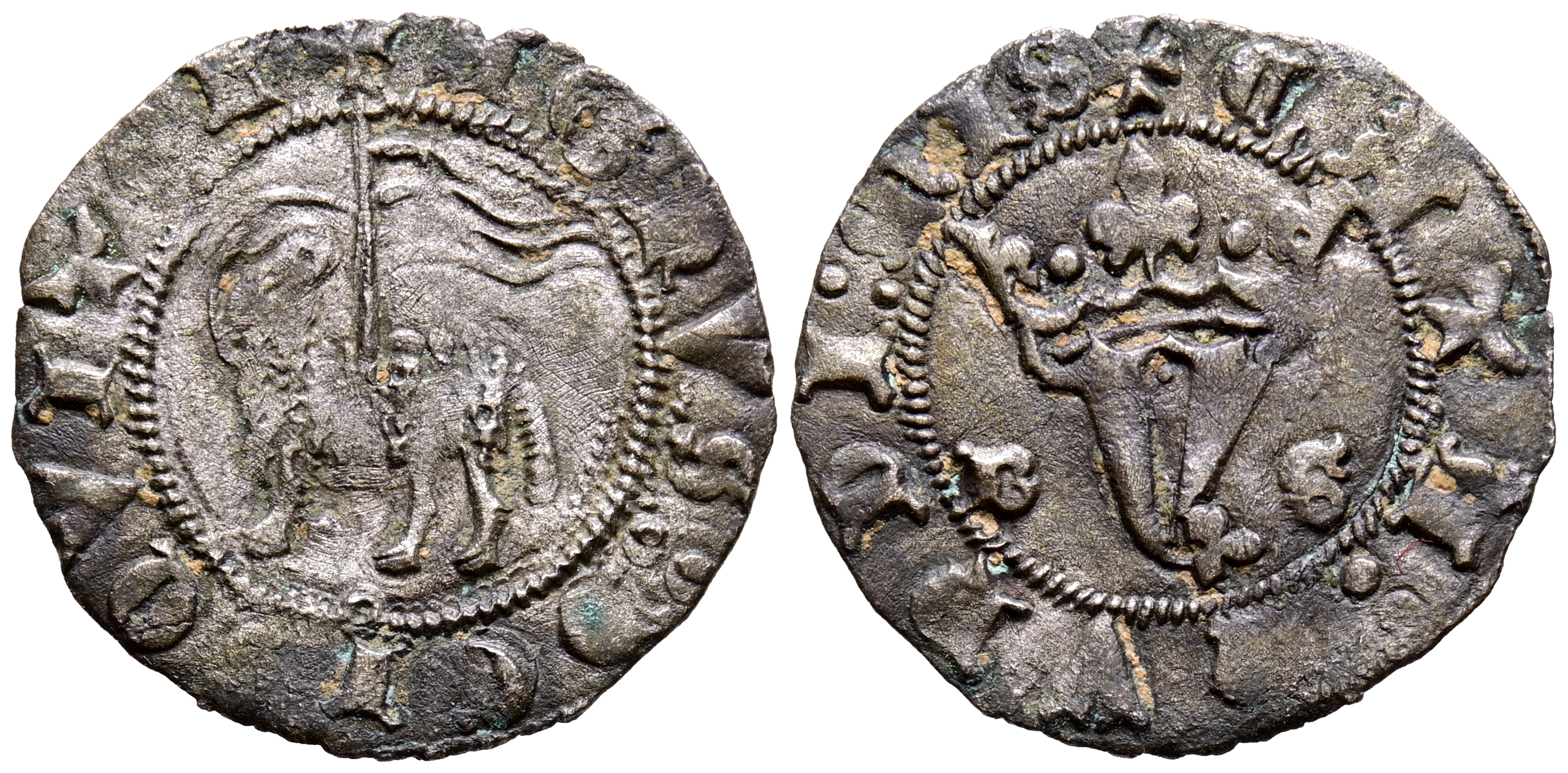 JUAN I (1379-1390). Blanca del Agnus Dei. (Ve. 1,41g/22mm). Burgos. (Imperatrix J1:9.6; FAB-549). Anv: Agnus Dei a izquierda con estandarte y roel entre las patas, todo en gráfila circular, alrededor leyenda: AGNVS DEI QVIT. Rev: Y coronada flanqueada por B y S, todo dentro de gráfila circular, alrededor leyenda: CATA MVNDI MIS. EBC-.