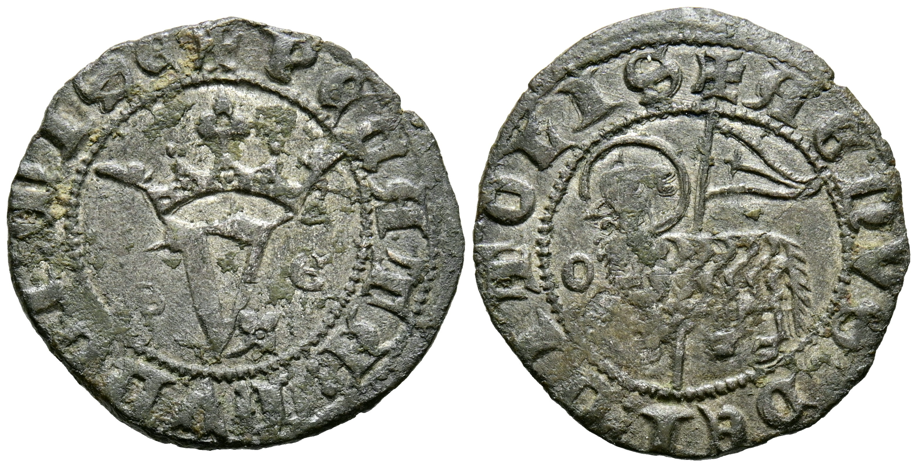 JUAN I (1379-1390). Blanca del Agnus Dei. (Ve. 2,21g/22mm). Segovia. (Imperatrix J1:9.31; FAB-554 var). Anv: Agnus Dei a izquierda con estandarte y O delante, todo dentro de gráfila circular y alrededor leyenda: AGNVS DEI QVTOLIS. Rev: Y coronada dentro de gráfila con las letras S y E a los lados, alrededor leyenda: PECATA MVNDI MISE. MBC+.