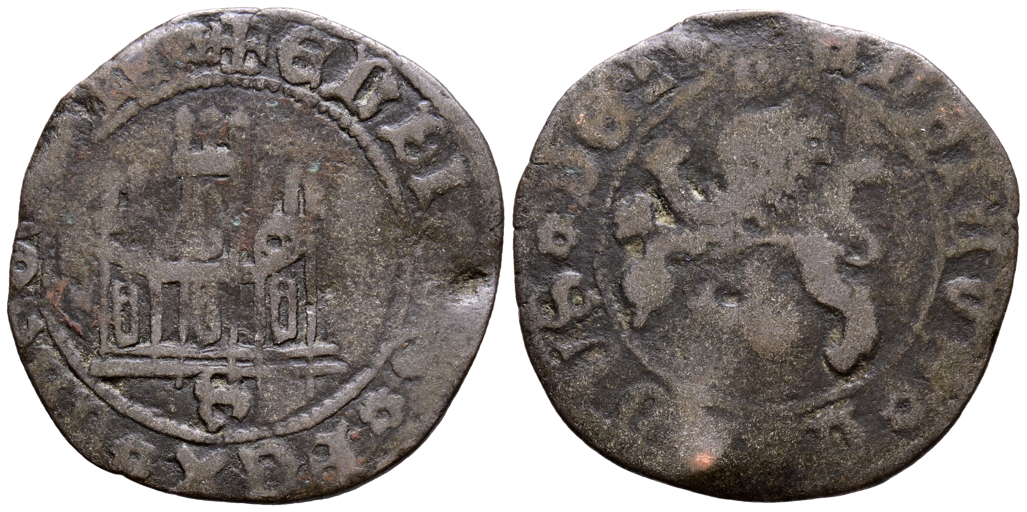 ENRIQUE IV (1454-1474). Maravedí. (Ve. 2,57g/24mm). Sevilla. (Imperatrix E4:20.79; FAB-806). Anv: Castillo, debajo: S, todo dentro de gráfila circular, alrededor leyenda: ENRICVS REX CASTELLE. Rev: León coronado y rampante a izquierda con granada a sus pies, todo dentro de gráfila circular, alrededor leyenda: ENRICVS CARTVS DEI G. MBC-.
