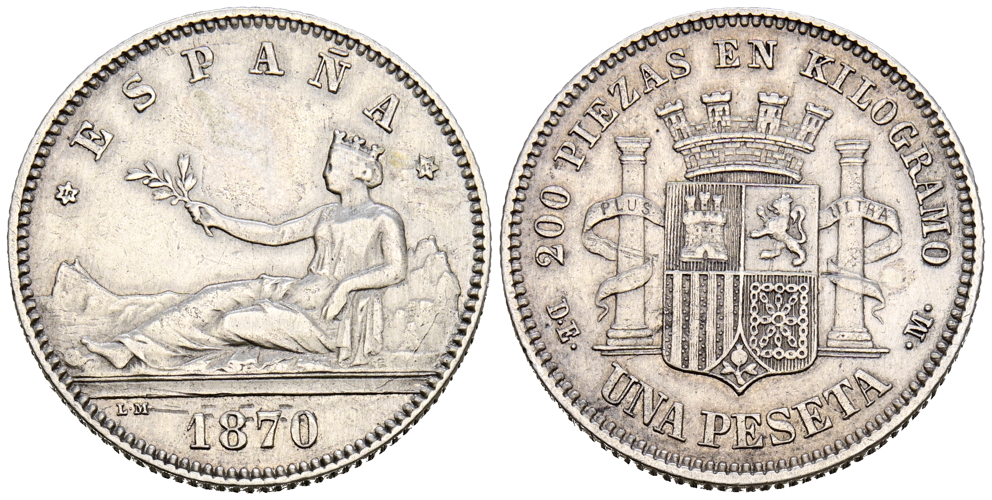 GOBIERNO PROVISIONAL (1868-1871). 1 Peseta. (Ar. 4,92g/23mm). 1870 *18-73. Madrid DEM. (Cal-2019-19). MBC. Estrellas perfectamente visibles.