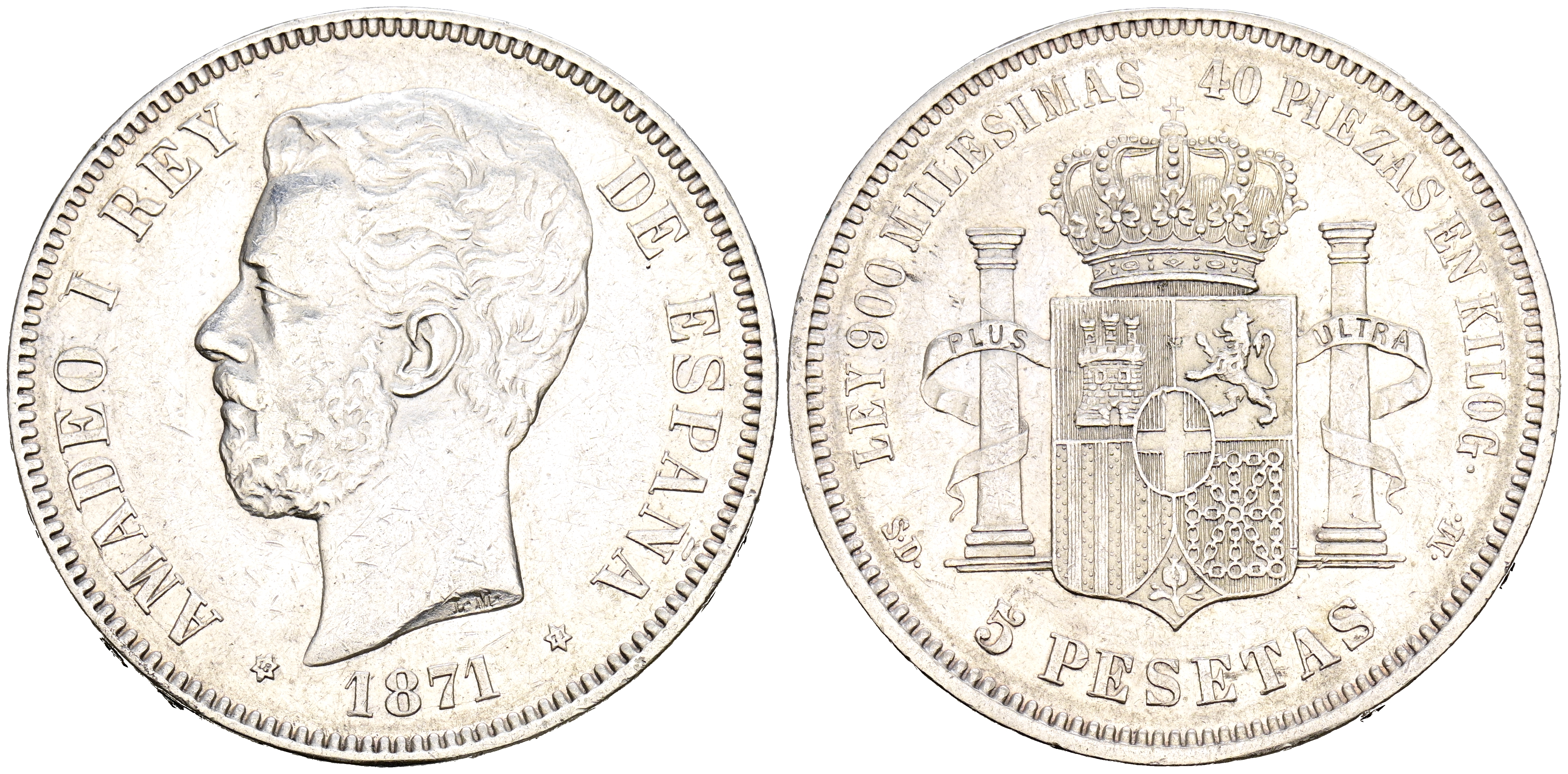 AMADEO I (1871-1873). 5 Pesetas. (Ar. 25,01g/37mm). 1871 *18-71. Madrid SDM. (Cal-2019-1). MBC+.