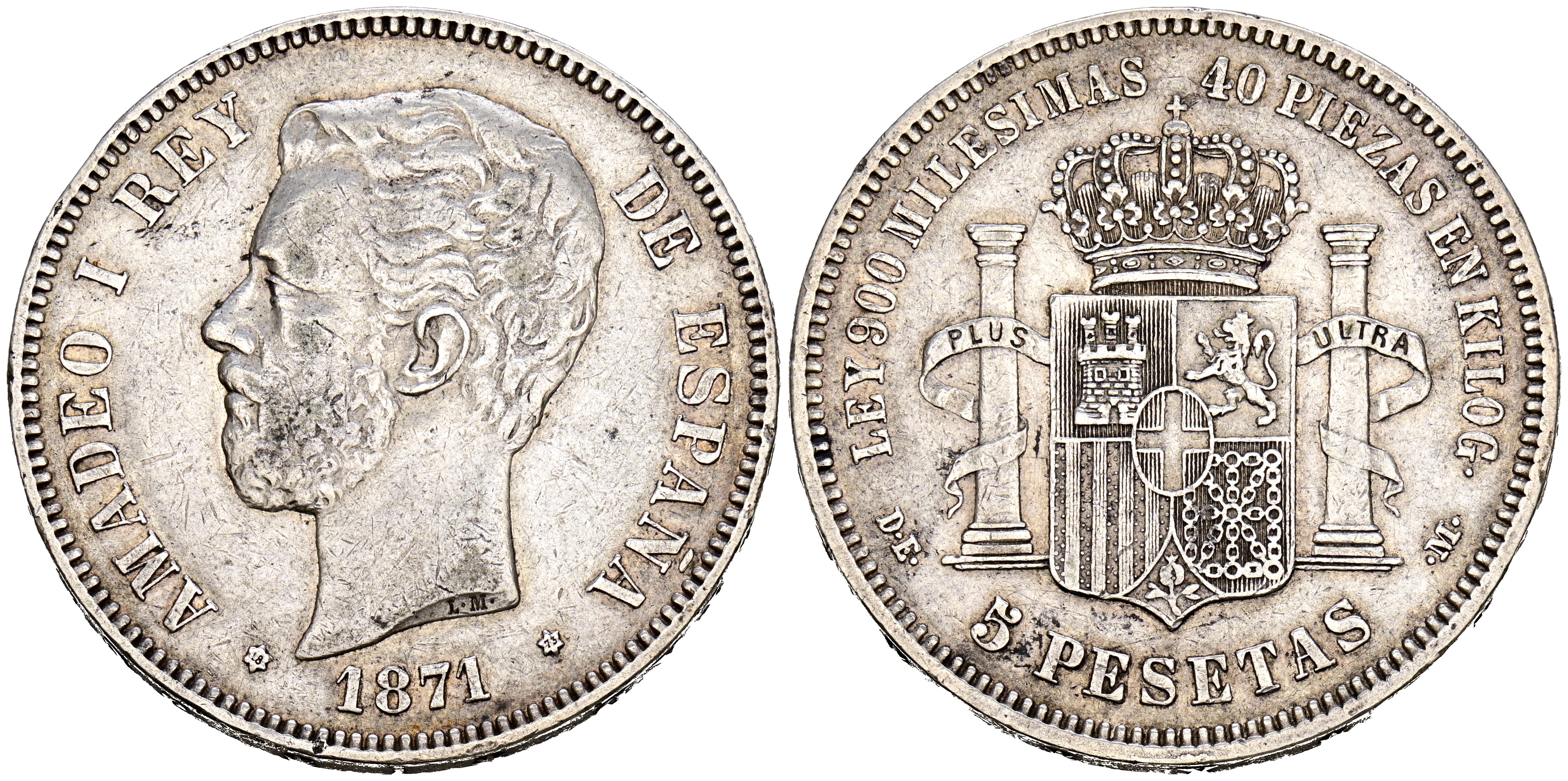 AMADEO I (1871-1873). 5 Pesetas. (Ar. 24,76g/37mm). 1871 *18-73. Madrid DEM. (Cal-2019-3). MBC. Escaso e interesante ejemplar.
