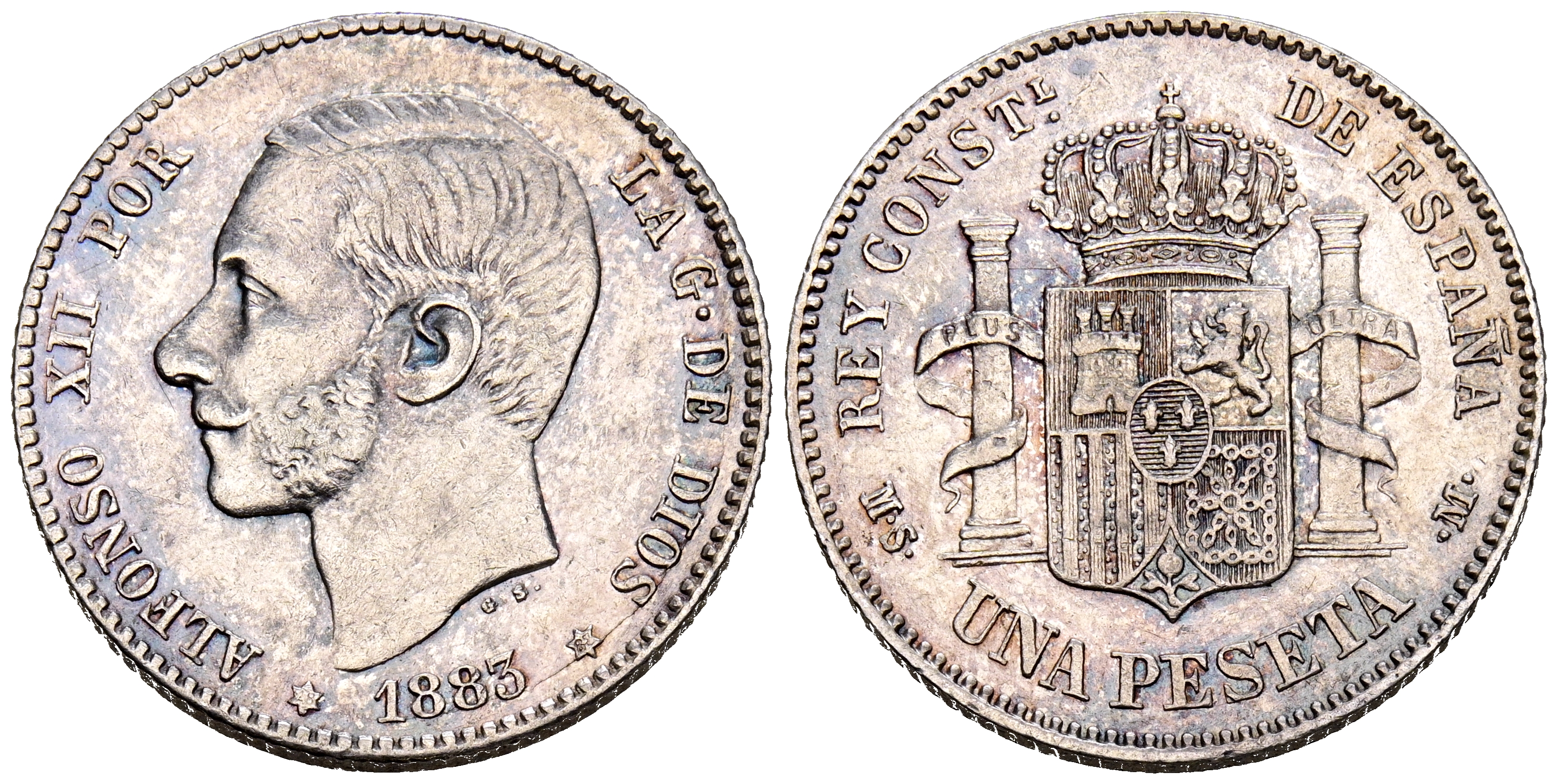 ALFONSO XII (1874-1885). 1 Peseta. (Ar. 5,03/23mm). 1883 *18-83. Madrid MSM. (Cal-2019-21). MBC+. Limpiada. Estrellas perfectamente visibles. Escasa.