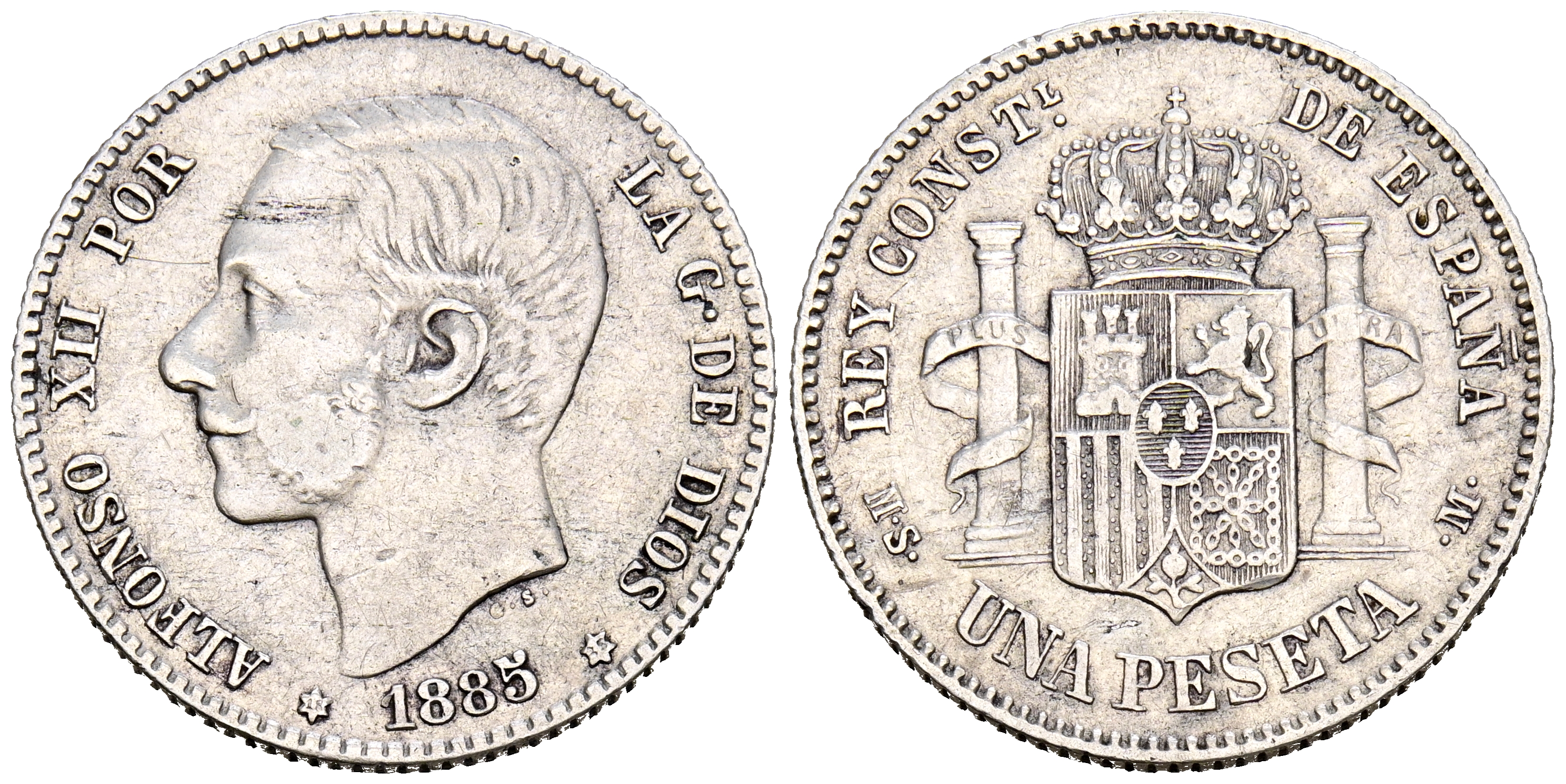 ALFONSO XII. (1874-1885). 1 Peseta. (Ar. 4,99g/23mm). 1885 *18-85. Madrid MSM. (Cal-2019-24). MBC-. Estrellas flojas pero visibles. Escasa.