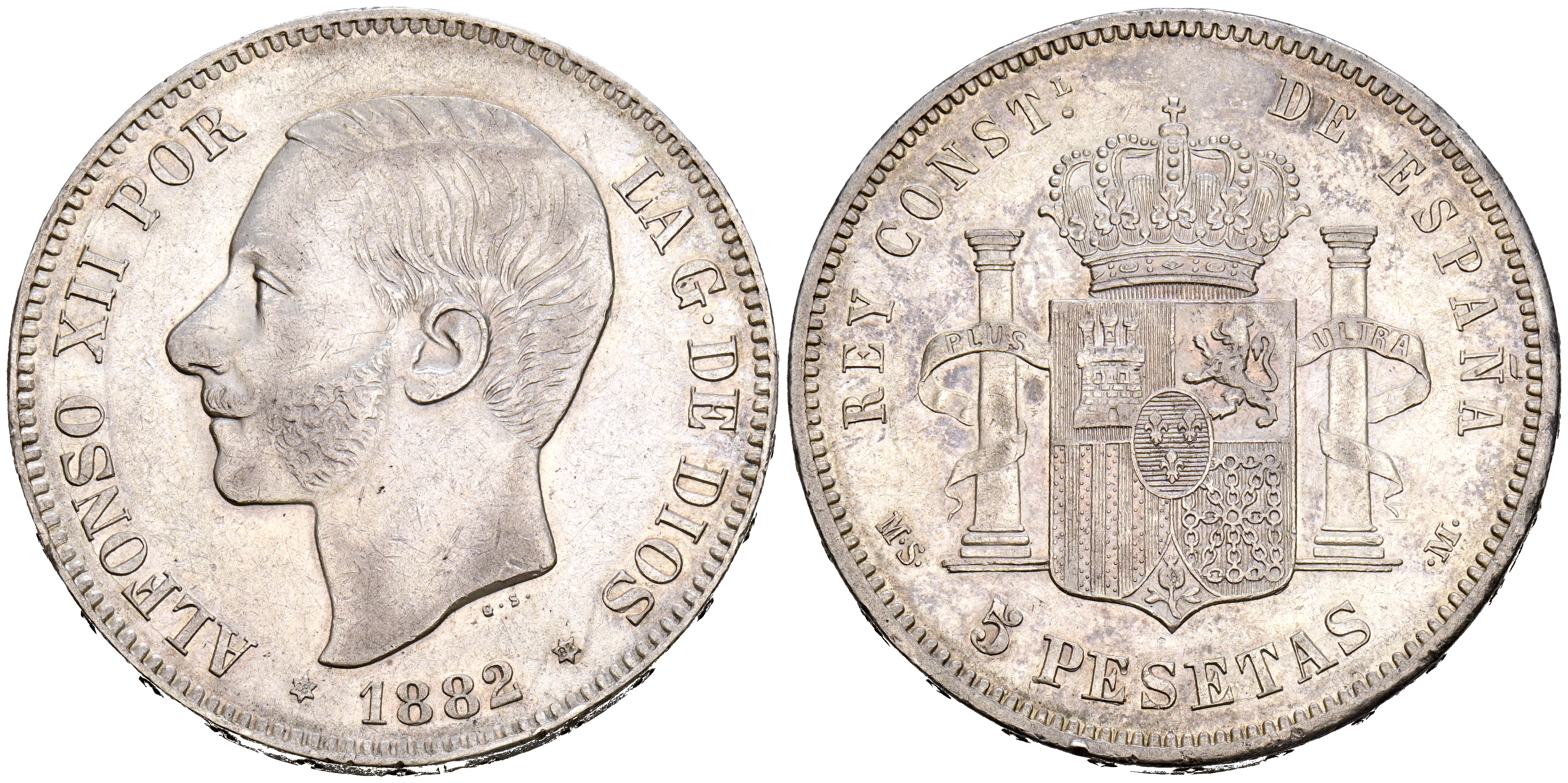 ALFONSO XII (1874-1885). 5 Pesetas. (Ar. 24,63g/37mm). 1882/1 *18-82/1. Madrid MSM. (Cal-2019-46). EBC-. Escasa.